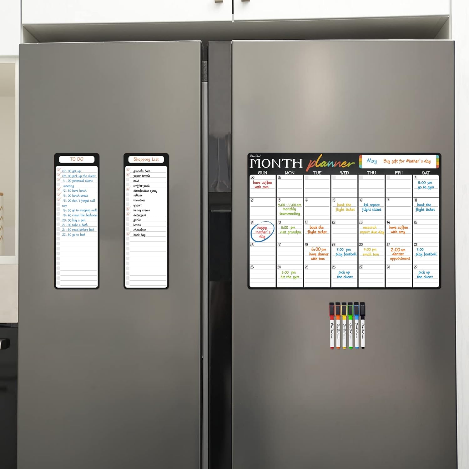 - Fine-point markers included – We also provide 6 extra-fine point markers with different colors, so you may use your own color coding. These magnetic markers stay conveniently attached to your fridge.
