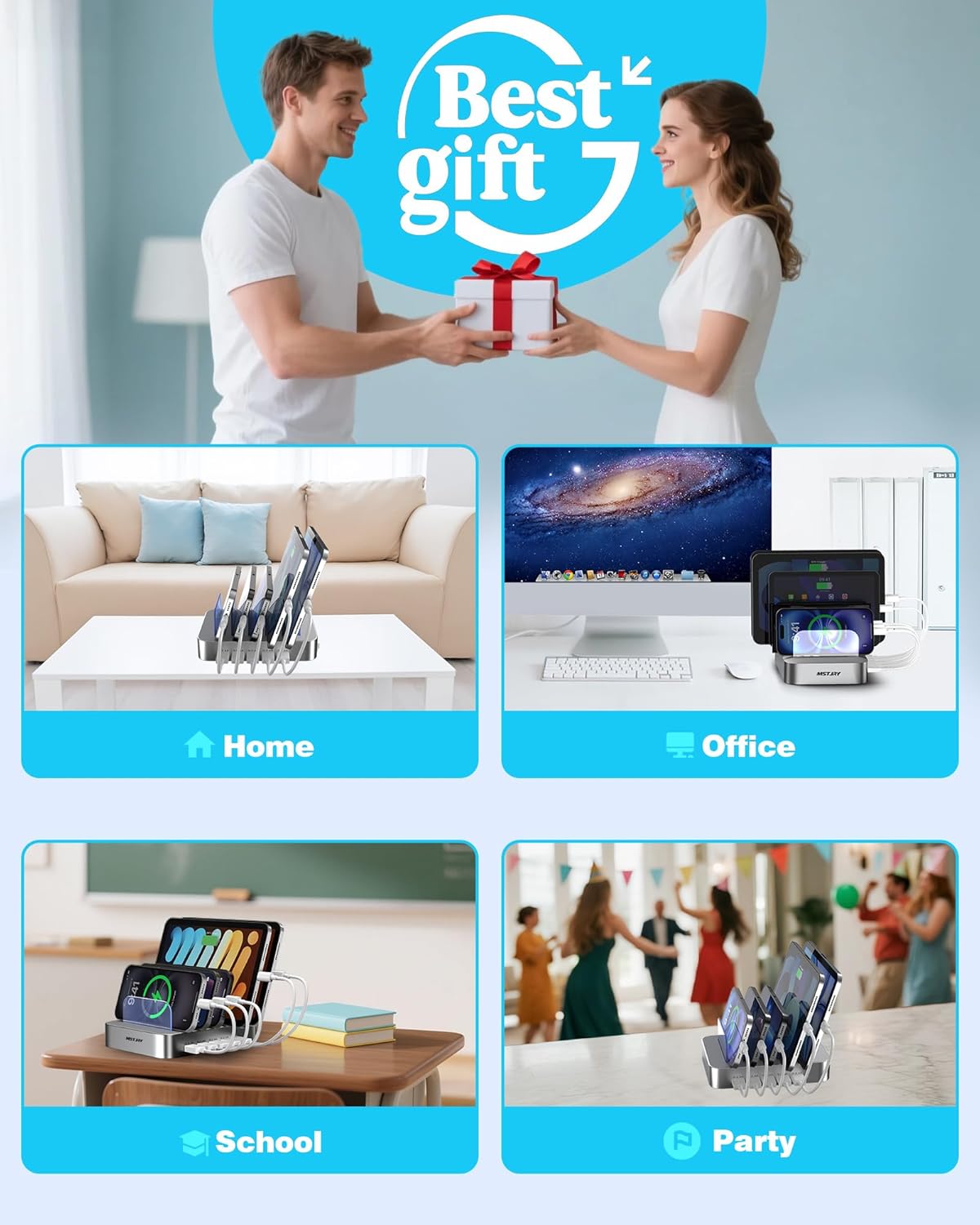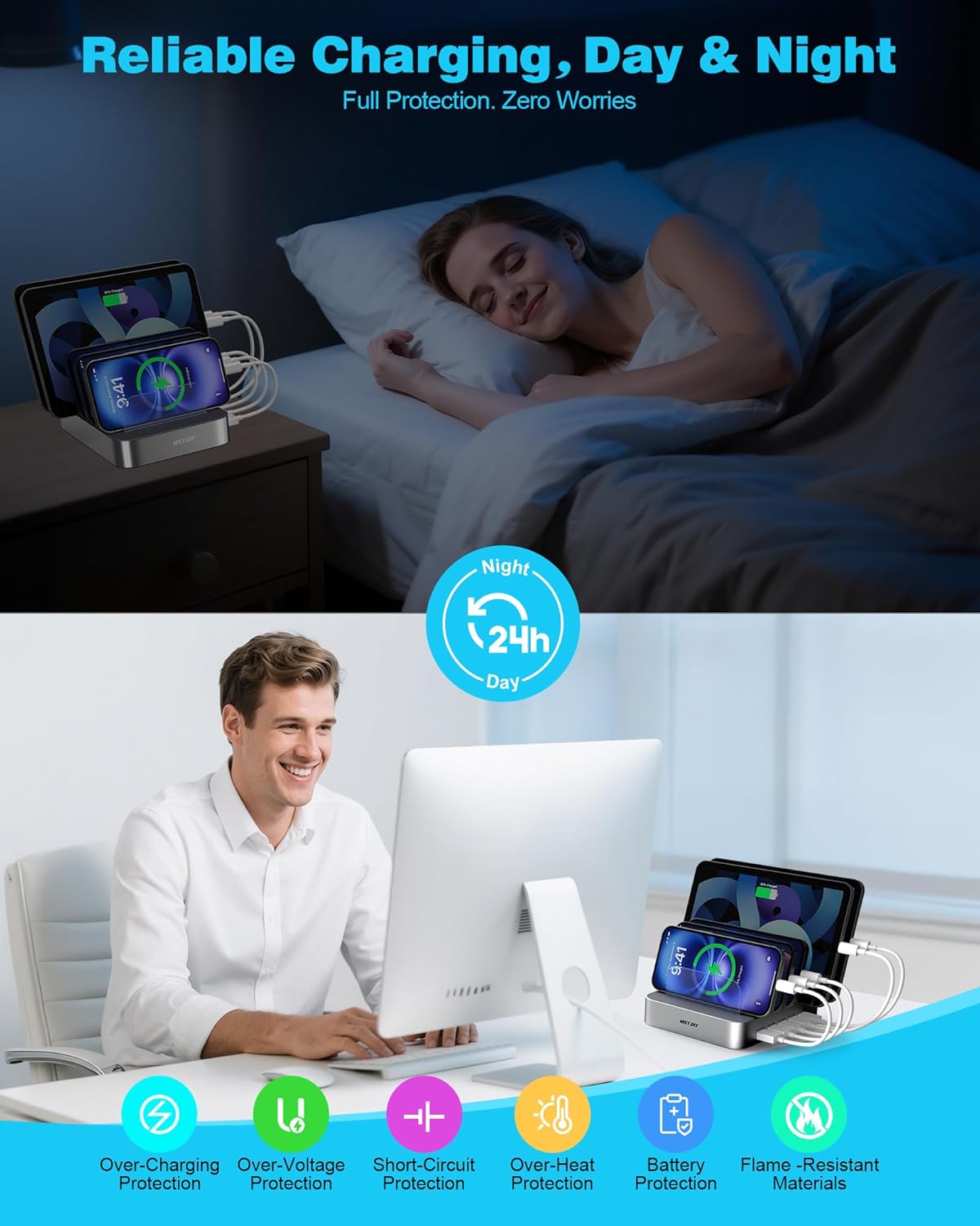 - 【Fast and Smart】This charging station for multiple devices will charge your smartphones, and tablets up to 80% than other USB-A charger stations with 2.0A or less. Our multi port charging stations will automatically detect your devices and adjust voltage for minimal charging time.