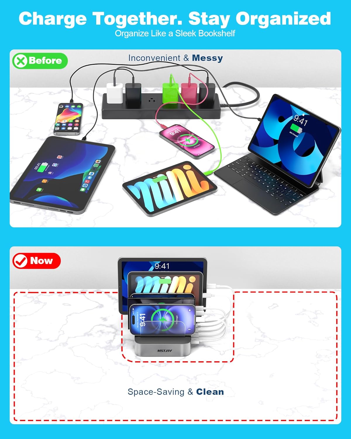 - 【Universal Compatibility】The charging station comes with 7 cables that are designed for your lphone 16 Series,15,15Pro,14, 14Pro, lphone 13, 13Pro, 12, 11, 11Pro, XS, XS Max, XR, X, SE, 8, 8 Plus, 7, 7 Plus, Ipads, Samsung Galaxy 23 / 22 / 21 Series, tablets, and other electronics. USB-A charging station with 3 ios cables, 2 micro-USB cables and 2 USB-C cables.