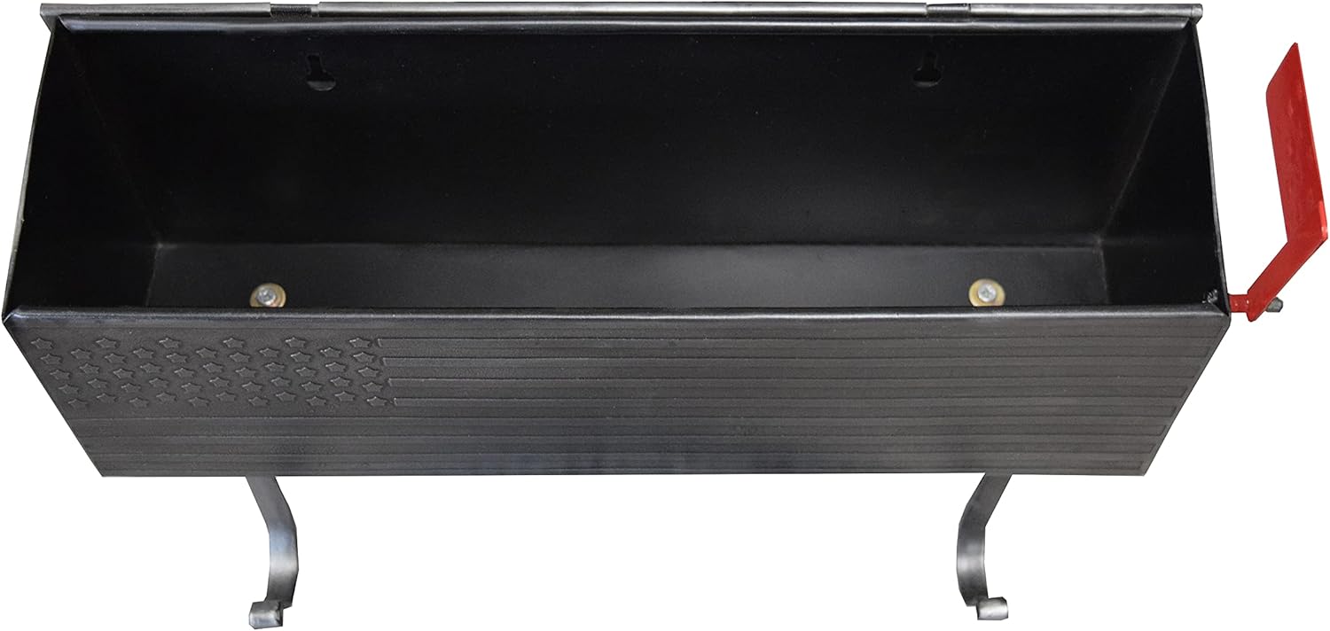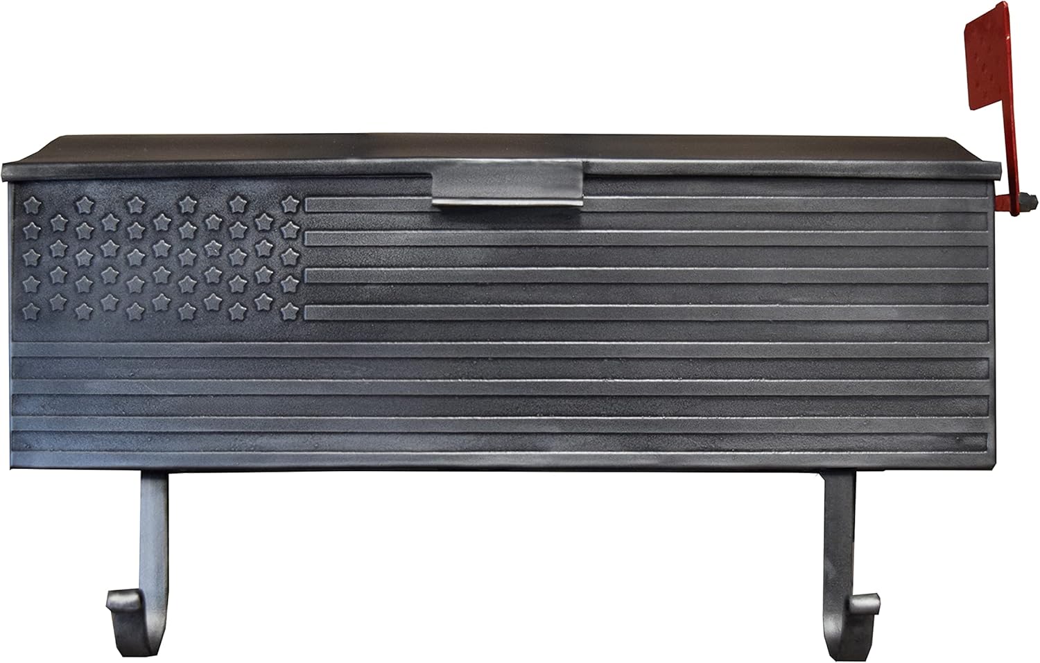 - Silver Patriotic Metal Wall Mounted Mailbox with Outgoing Mail Flag and Newspaper Hangers exterior dimensions are: 16.5in L x 4.5in W x 6in H, 4 Lbs.