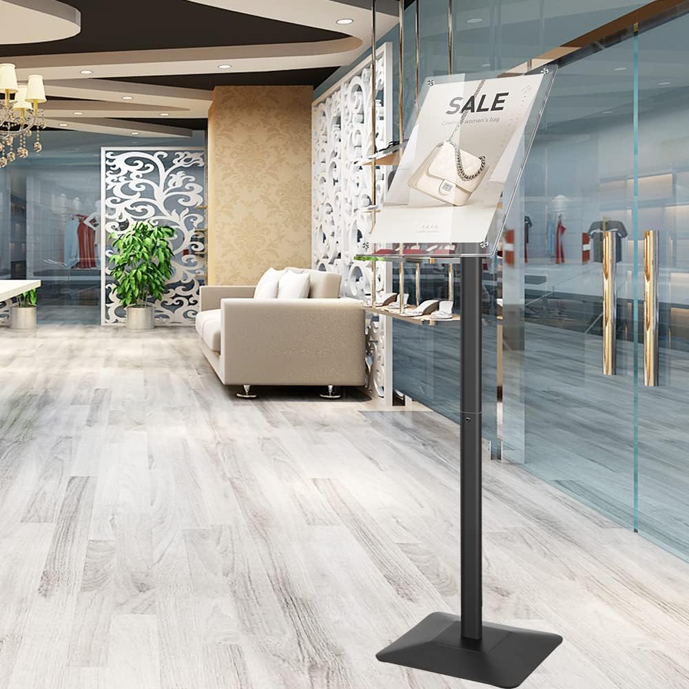 - Multi-angle Display floor stand - Sturdy metal material floor standing acrylic sign holder,the rotating head feature allows the advertisement to be used in portrait or landscape as you like.Our new stylish Floor Sign Holder captures the customer's attention in all frequented traffic areas.