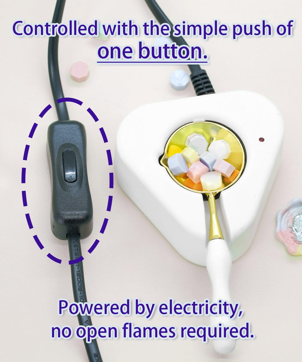 - [Warmer Usage Instructions]①Connect the plug to the power source, turn on the switch, and preheat the spoon for about 2 minutes.②Place the sealing wax pellets into the spoon.③Pour the melted sealing wax from the spoon.④Use the stamp to imprint on the melted sealing wax.