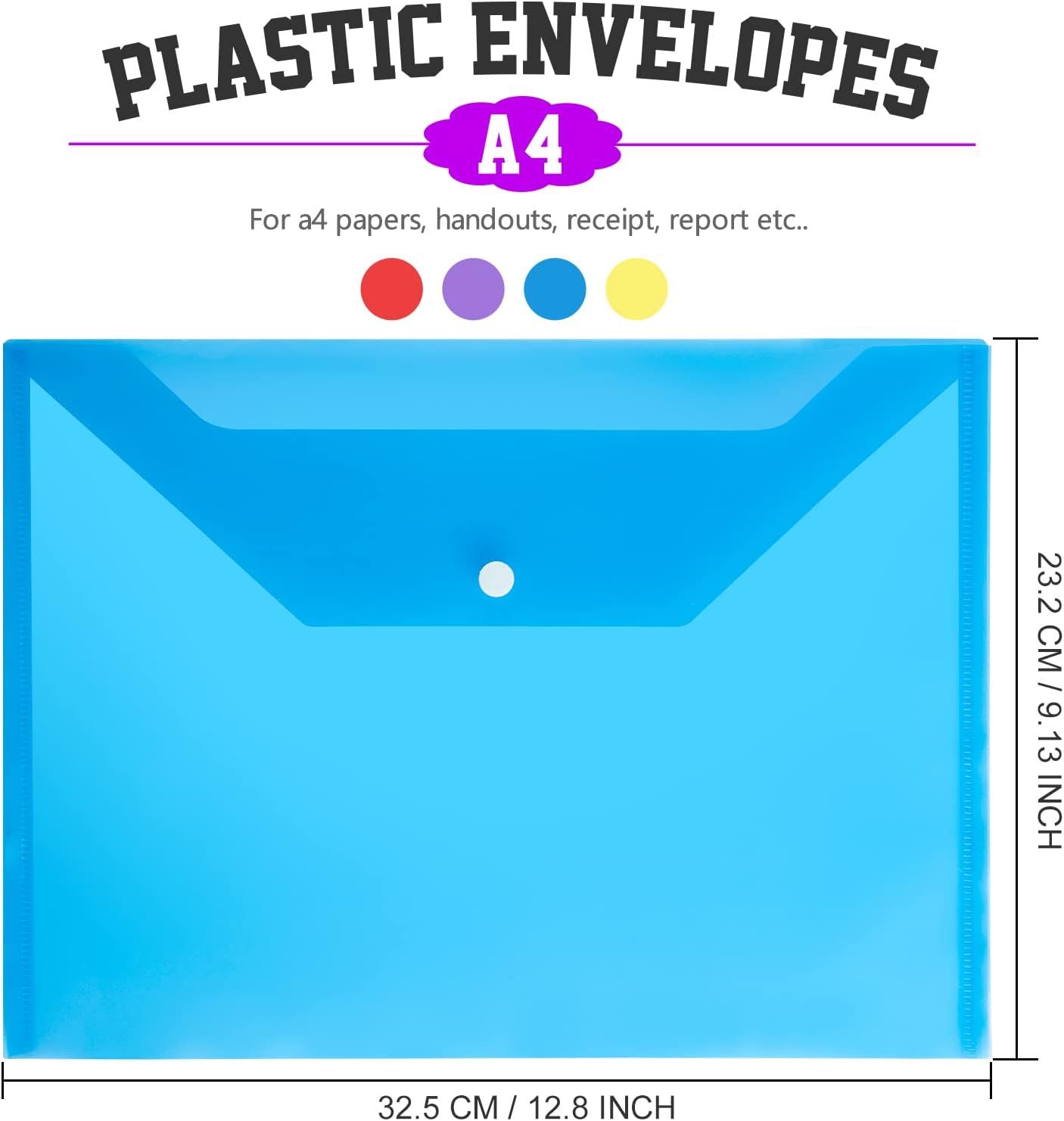 LEOBRO Plastic File Folders for Documents, 4 PCS File Folders, A4 Size Plastic Folders, Plastic Envelopes with Snap Closure, Clear Envelopes Pouches Folder Organizer Document Holder, Filing Envelopes
