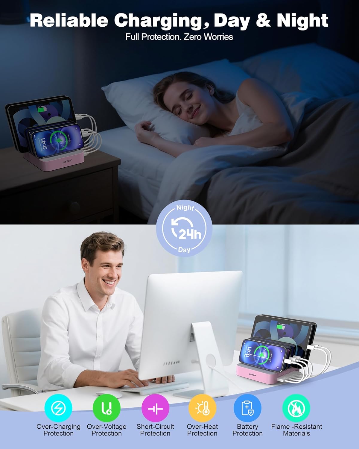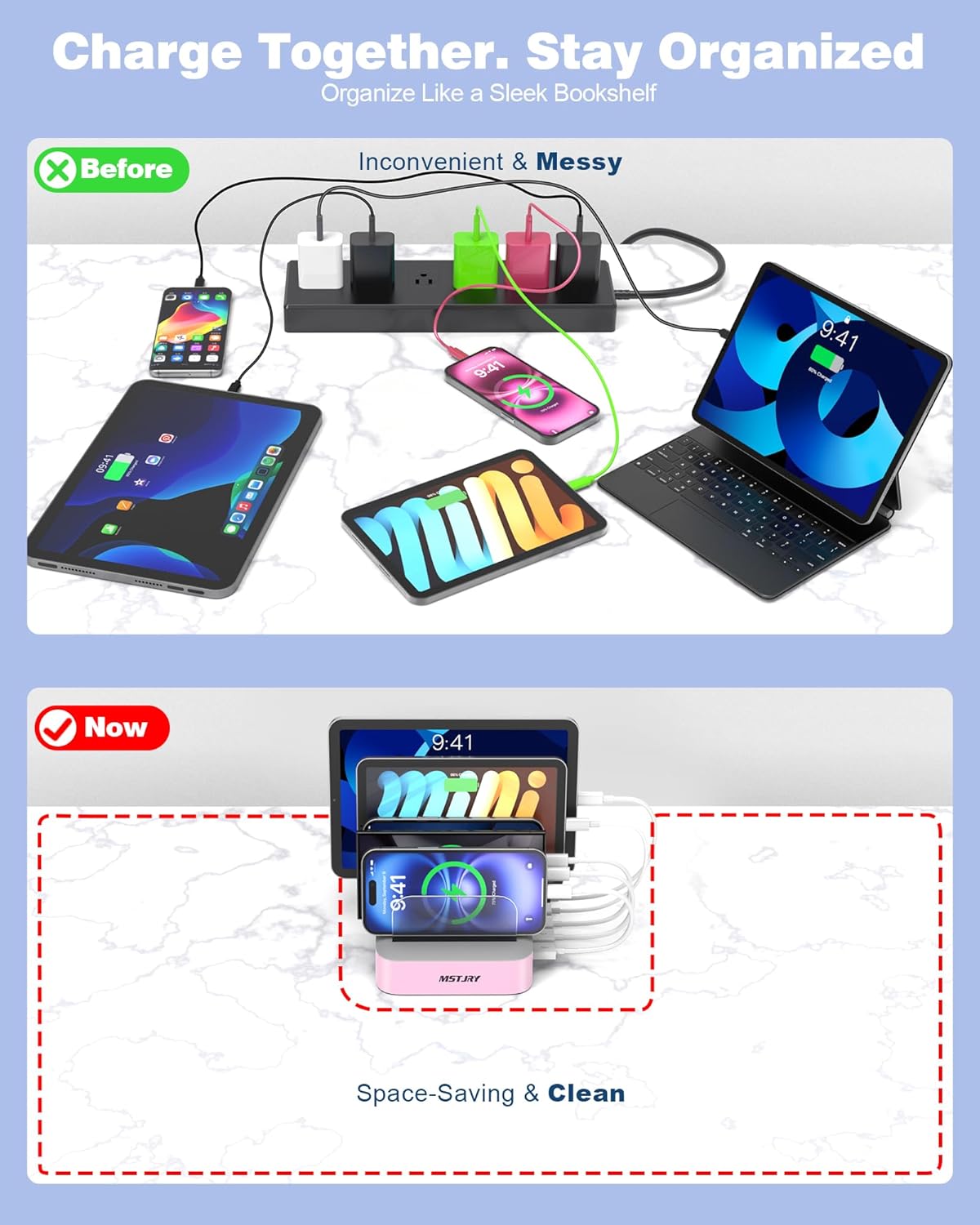 MSTJRY Charging Station for Multiple Devices : 5 Port Multi USB-A Charger Stations Multi-Device Organizer Charging Dock Designed for iPhone iPad Cell Phone Tablets (7 Short Cables Included), Pink