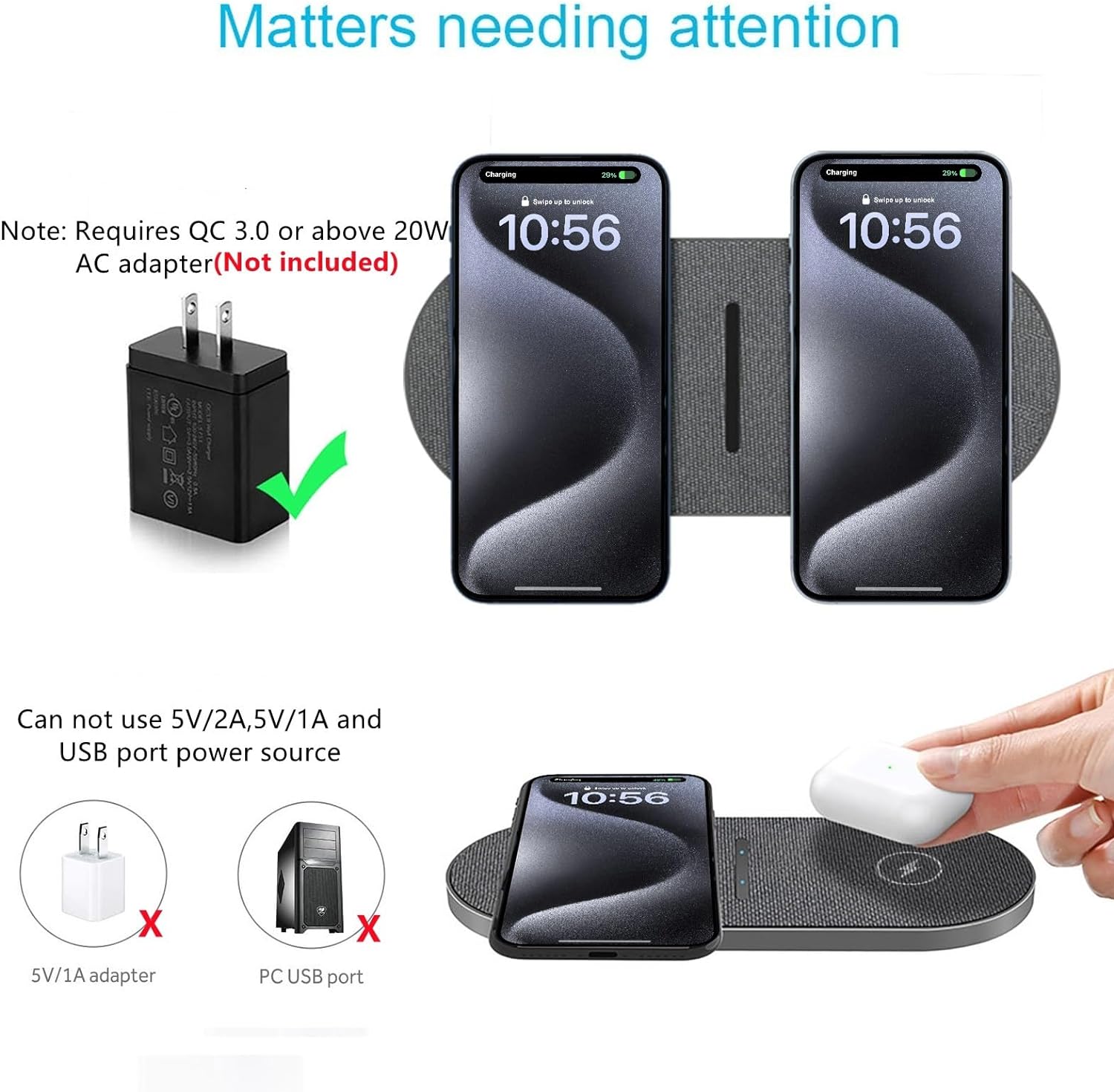 - What You Get:1*Dual 20W Fast Wireless Charging Pad,1*3.3-ft Type-C to Type-C Charging Cable,1*3.3-ft USB to Type-C Charging Cable,1*User Manual. Charging power straight through phone cases within 6mm/0.23". Cases made of metal, attachments such as magnets, cards, grips will interfere with charging. (NOTE: The wireless charger must work with PD18W/QC 3.0 Adapter(NOT INCLUDED))