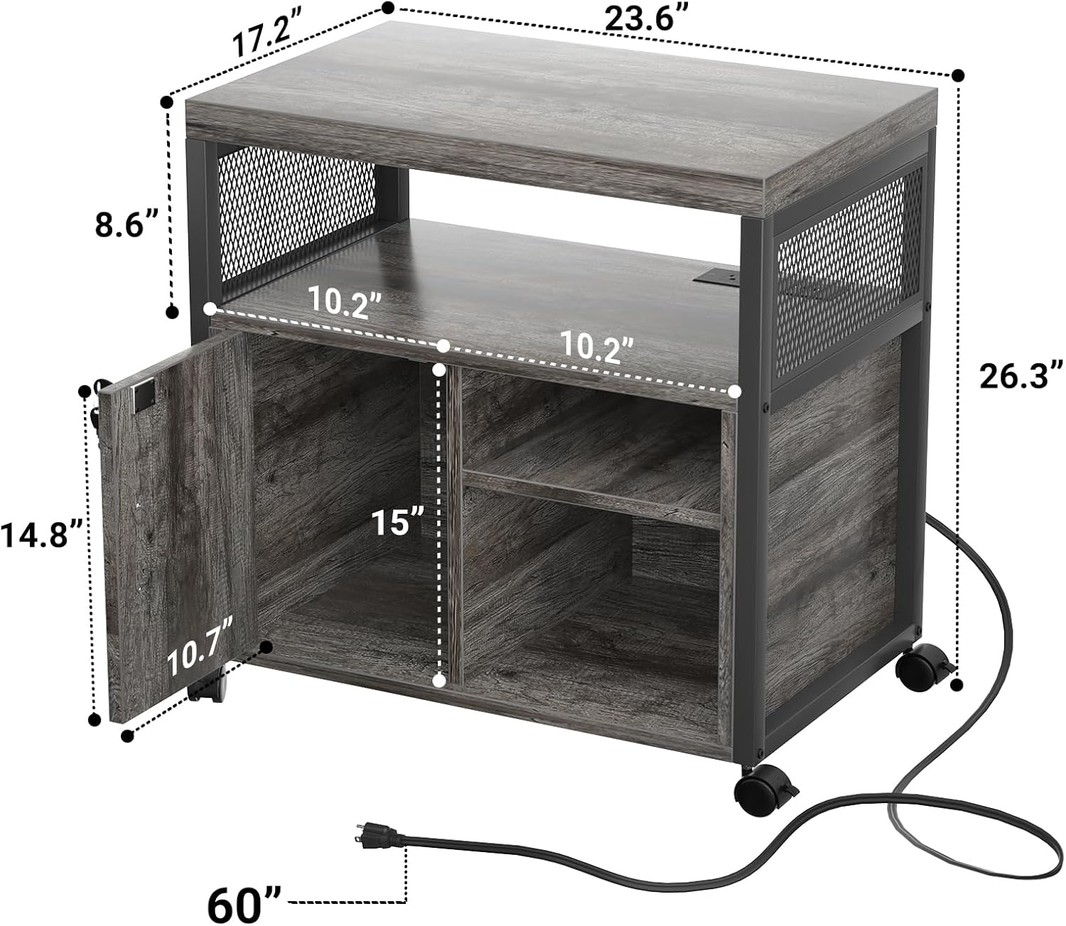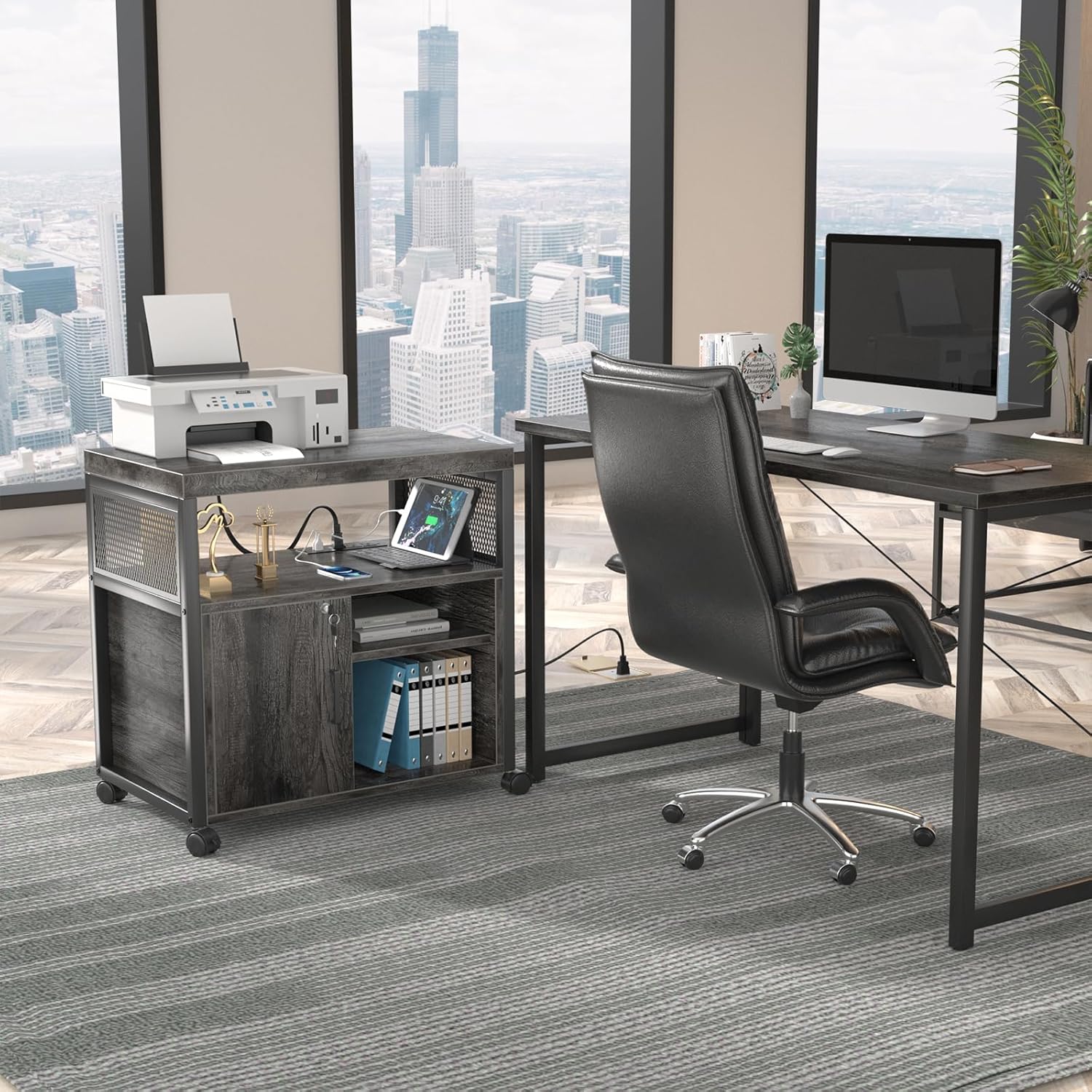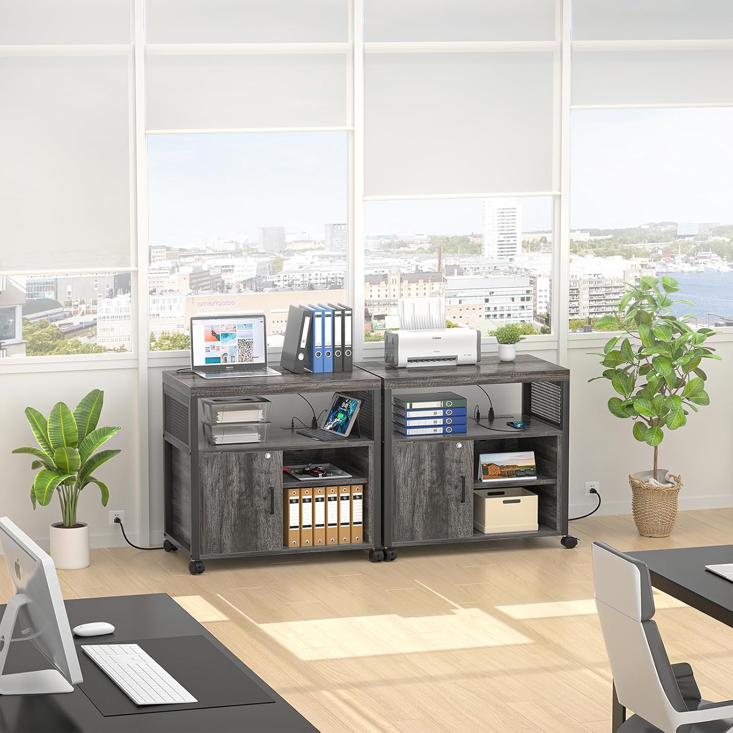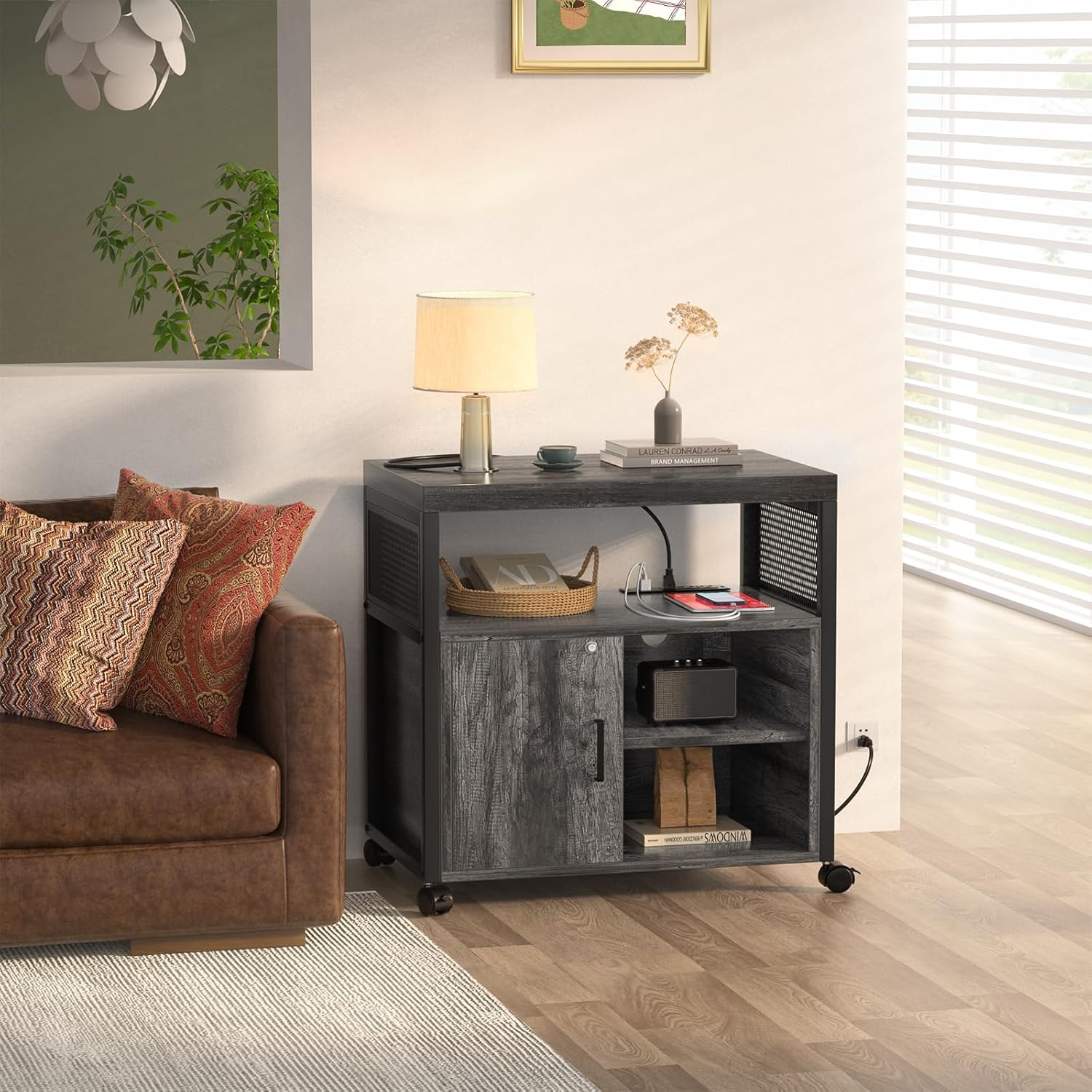 - 👍【Multifunctional】 This rolling printer stand featured with a lockable door, which allow convenient file access and add security that keep your business private. The two open shelves is great to store and display for binders, folders, books, furnishing articles or decor. You can also adjust the shelves height as your different needs.