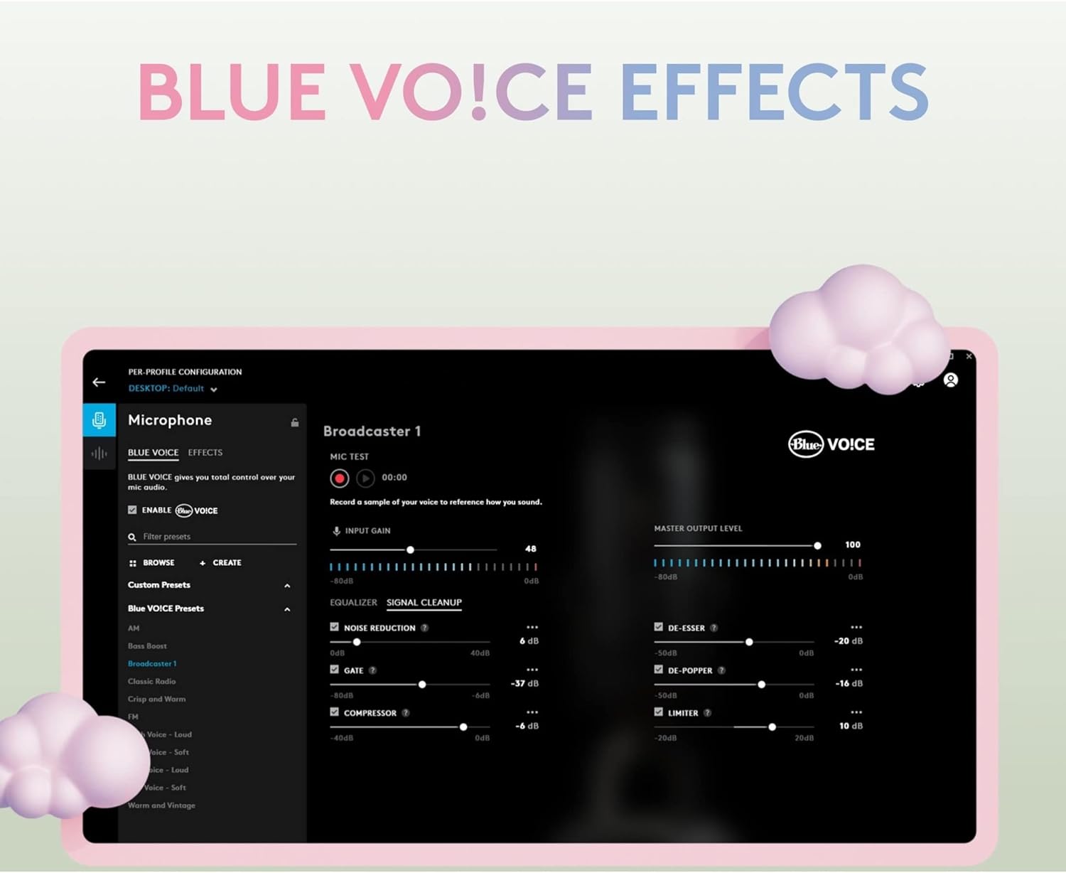 - Blue VOICE software: Elevate your streamings and recordings with clear broadcast vocal sound and entertain your audience with enhanced effects, advanced modulation and HD audio samples