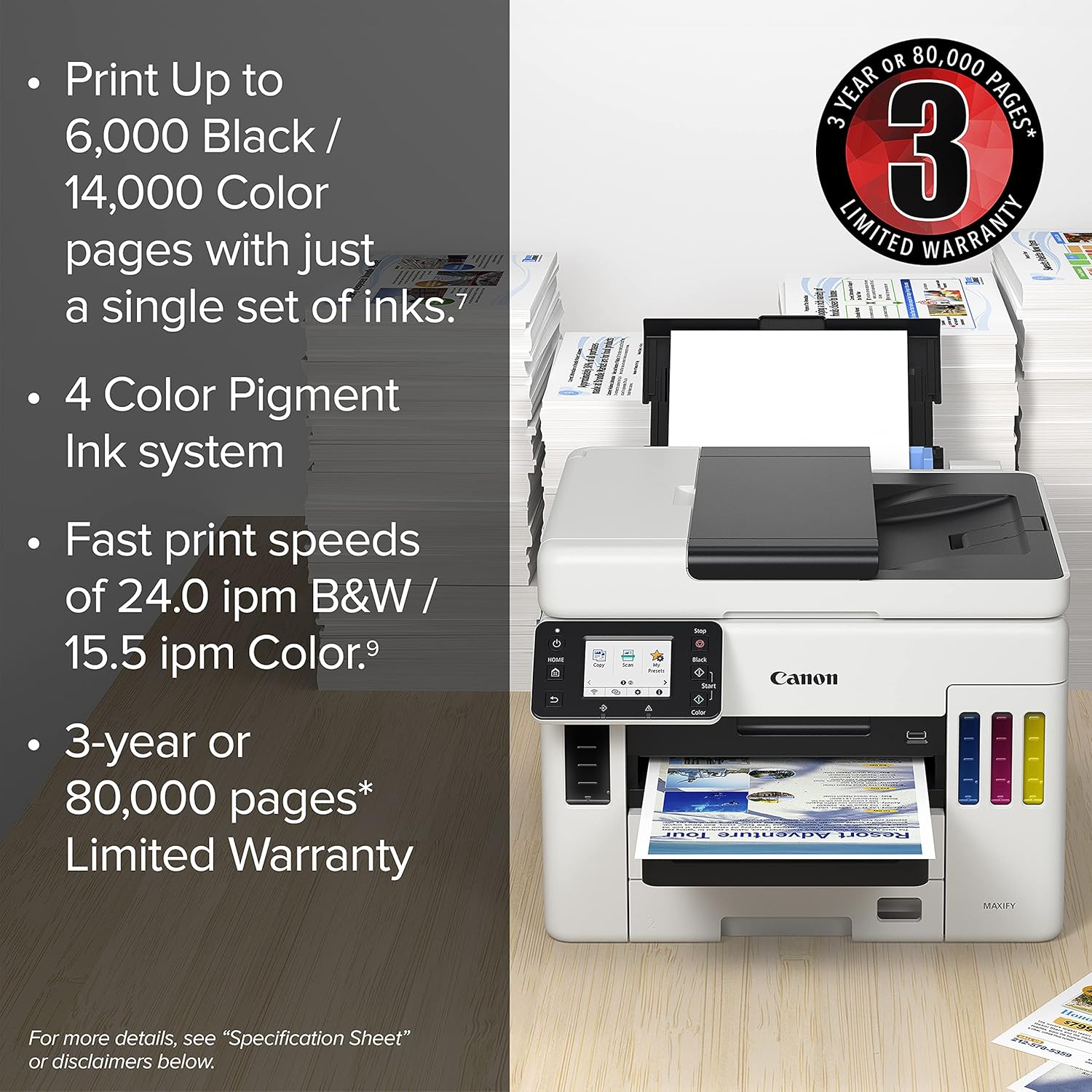 - Print up to 6,000 black & white / 14,000 color pages using a single set of inks! (1)