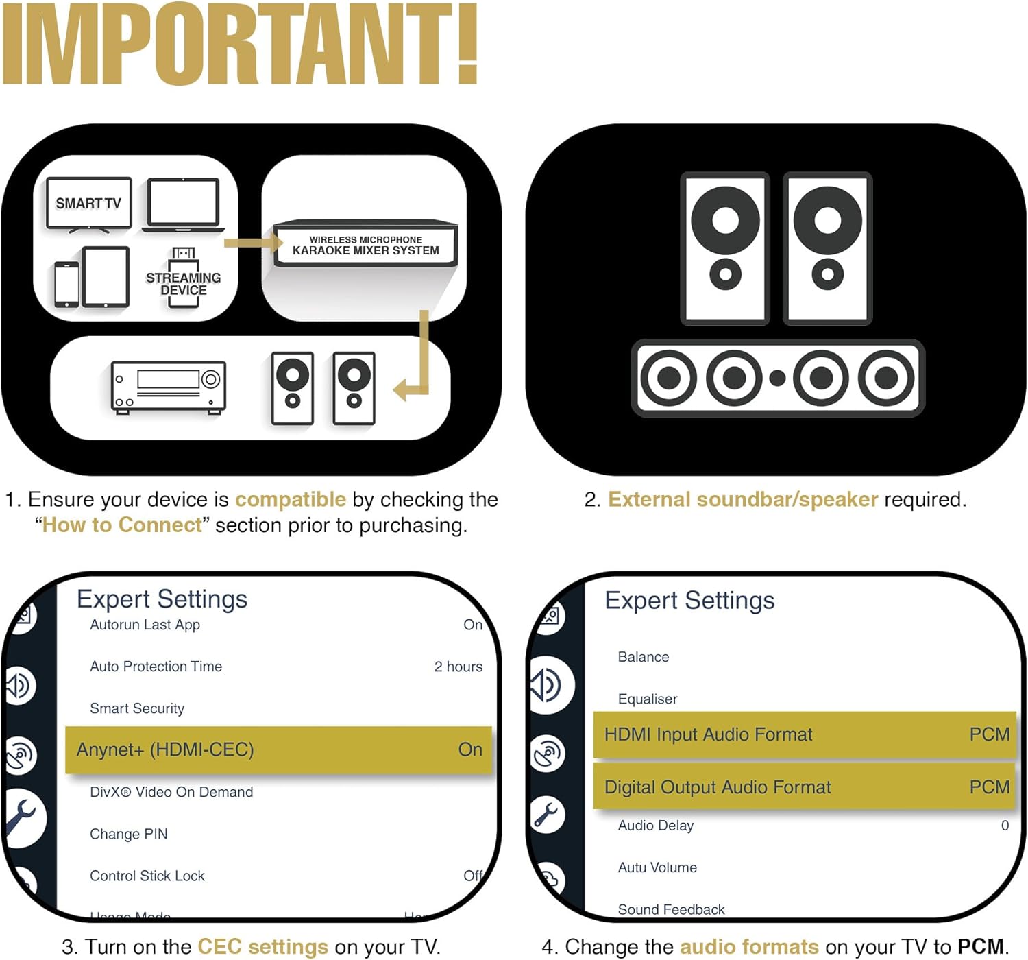 - CONNECTION DIAGRAM: 1. To use this product via the TV connection, refer to the picture of “Connection Instructions”, enable your TV’s ARC function, PCM setting and choose external speakers in the TV settings. 2. If you are experiencing little to no volume for the mics, turn the volume much higher on your TV, Sound Bar, and Receiver; then on the SWM16-MAX mixer, turn the volume knob low to mid level (20%-30%).