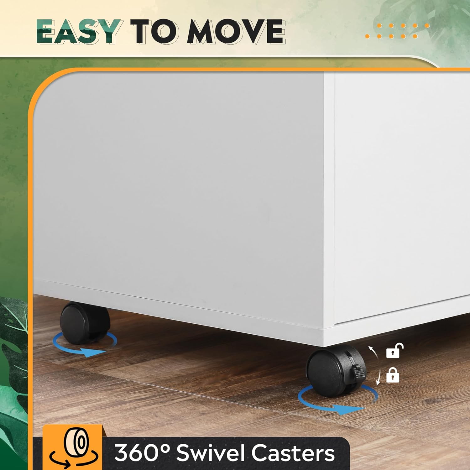 - Easy Mobility: The wooden file cabinet is equipped with 5 rolling wheels, allowing it to be easily moved and positioned beside or under desk. The front 2 wheels have built-in brakes and the bottom center is equipped with anti-tip casters to keep the cabinet stable.