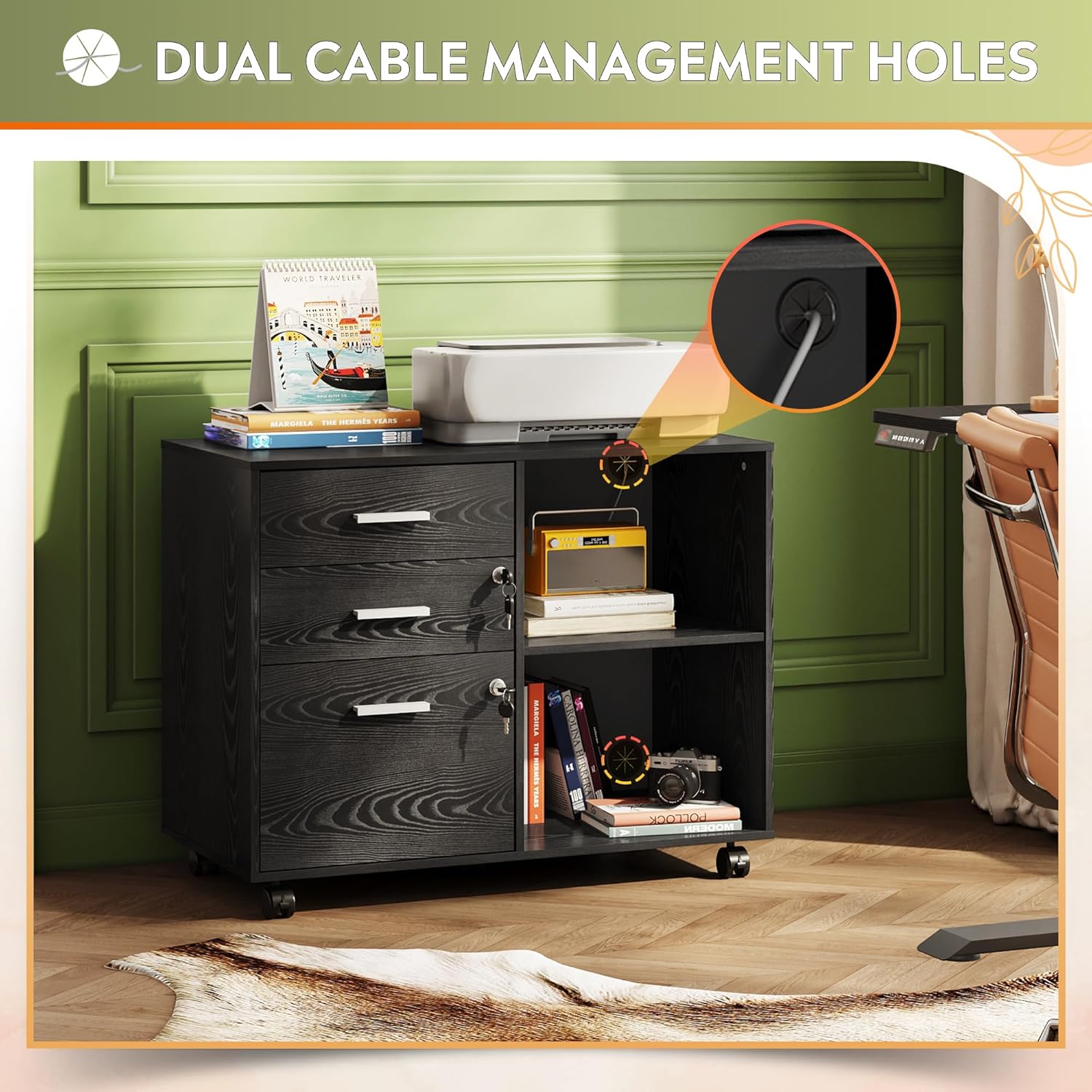 - Easy Mobility: The wooden file cabinet is equipped with 5 rolling wheels, allowing it to be easily moved and positioned beside or under desk. The front 2 wheels have built-in brakes and the bottom center is equipped with anti-tip casters to keep the cabinet stable.