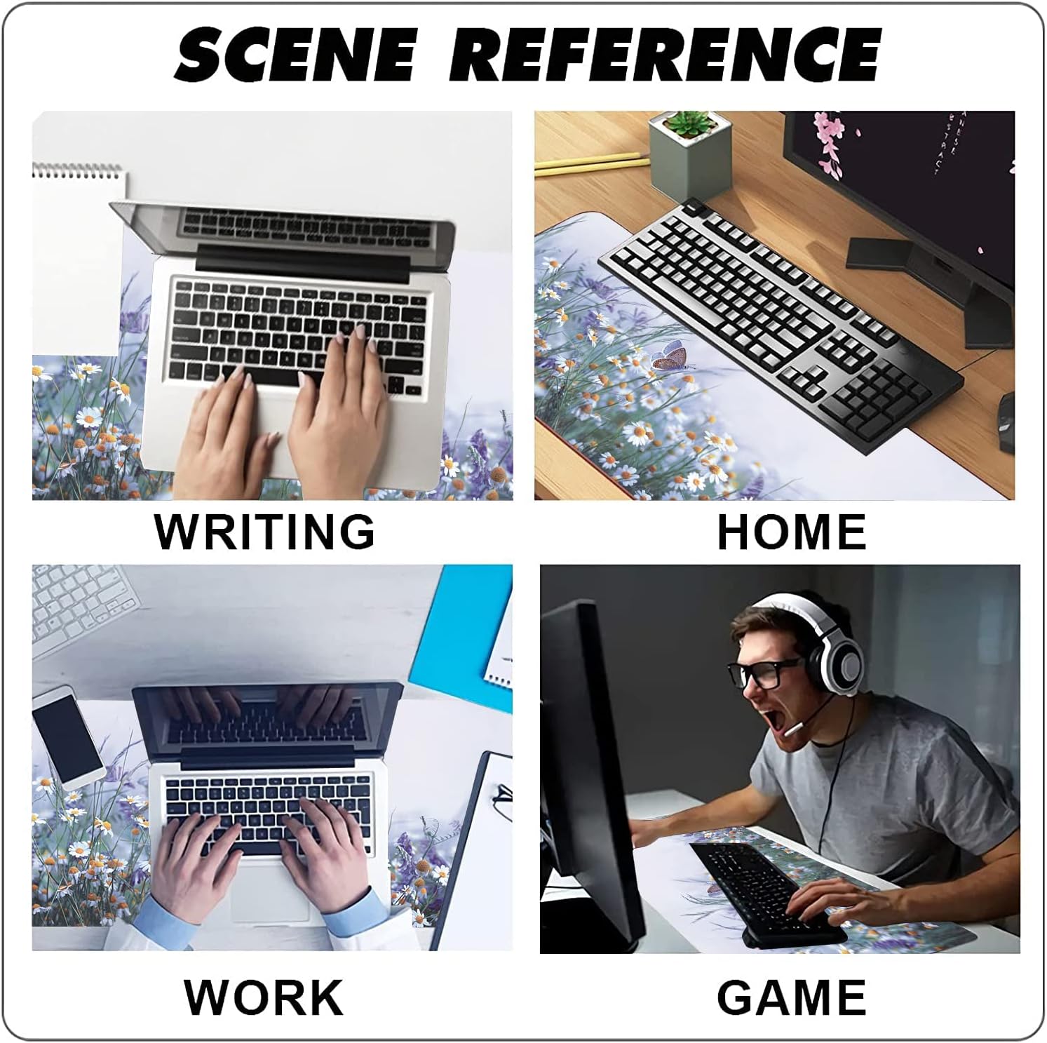 Extended Large Gaming Mouse Pad Wildflowers Chamomile and Butterflies XXL Size Keyboard Mouse Mat Desk Pad with Non Slip Rubber Base Stitched Edges Office Decor for Women Girls Men,35.4 x 15.7inch
