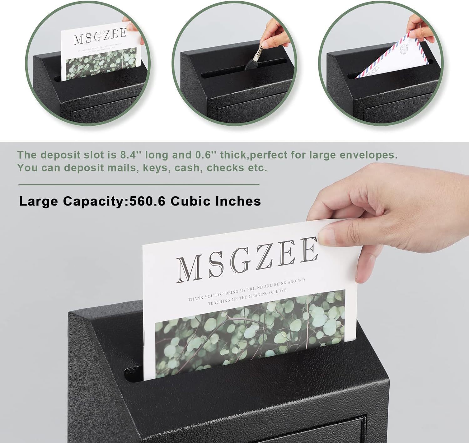 - 【PLENTY OF STORAGE SPACE】- The safe storage box measures 16.3(H)x9.9(L)x3.9(W) inches, offering plenty of storage space for your emails, documents, letters, etc. The size of the opening slot is 8.4x0.6 inches. Capacity: 560.6 cubic inches.