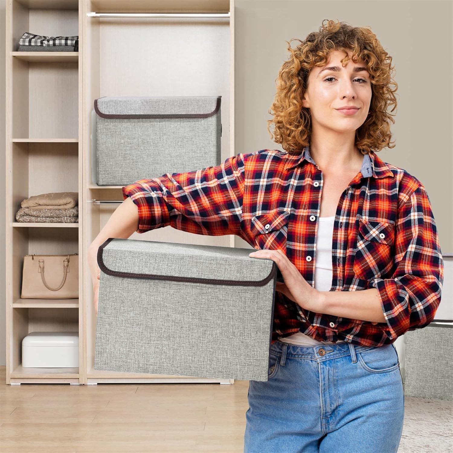 Linen Fabric Foldable Storage Cube Bin Organizer Basket with Flip-Top Lid & Handles, Large Clothes Blanket Box for Home, Office, Closet, Light Gray, 4 Pack 14.6 x 9.5 x 9.5”
