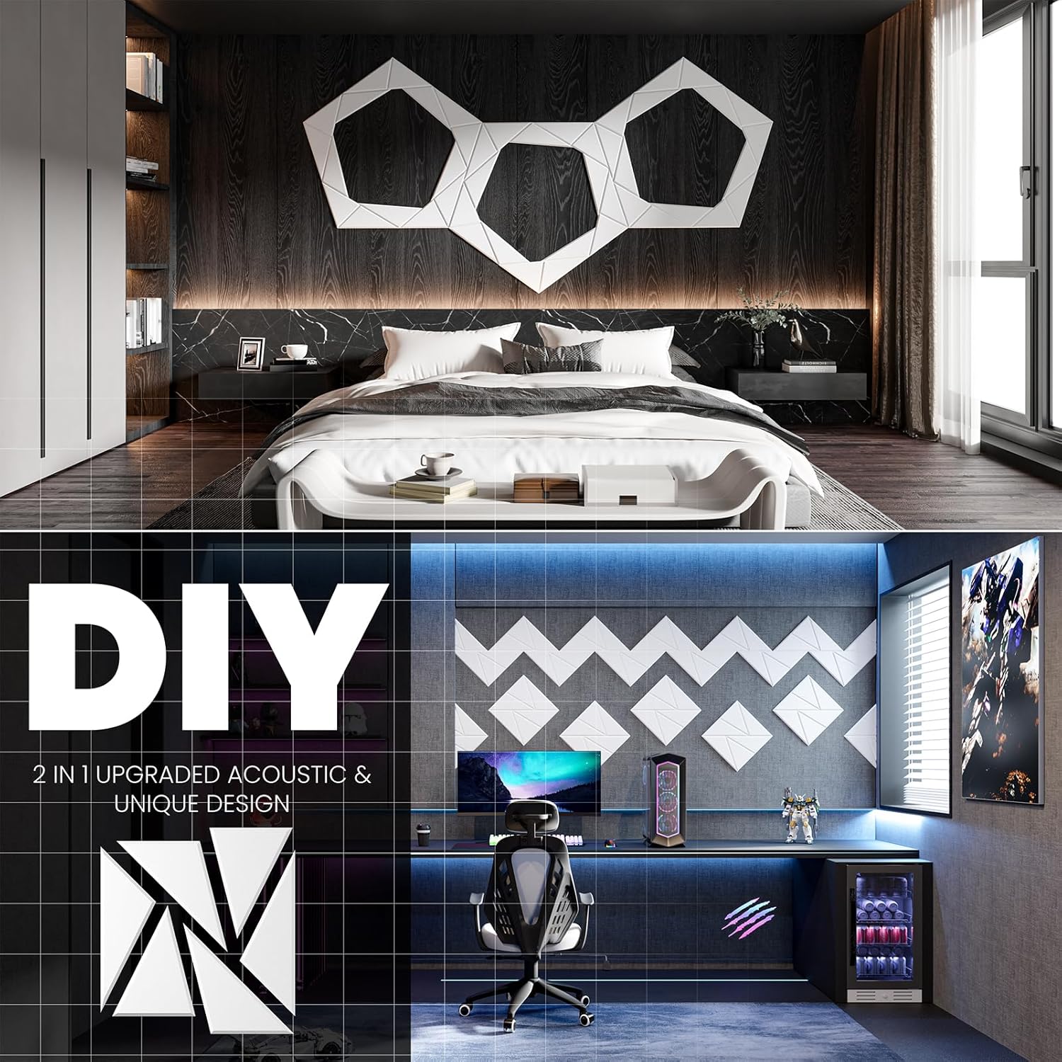 - 👍【Perfect for wall decoration】Be different from other acoustic panels,We have not only upgraded their acoustic performance,but aslo their appearance.Adopt beveled edge and multi-line design.They can be DIY into pinwheel patterns and multi-ring patterns.They absorb unnecessary sound while playing a good role in decorating the wall.Perfect for professional studios, video blogger,game room, podcasting, school,home theaters,offices,etc.