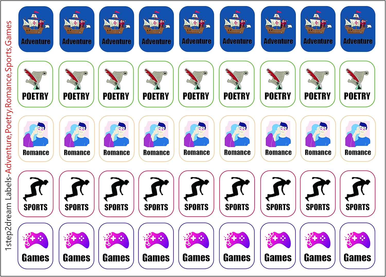- Organize special collections or communicate information to library patrons with these classification labels.Come with 90pcs Adventure,90pcs Poetry,90pcs Romance,90pcs Sports,90pcs Games.