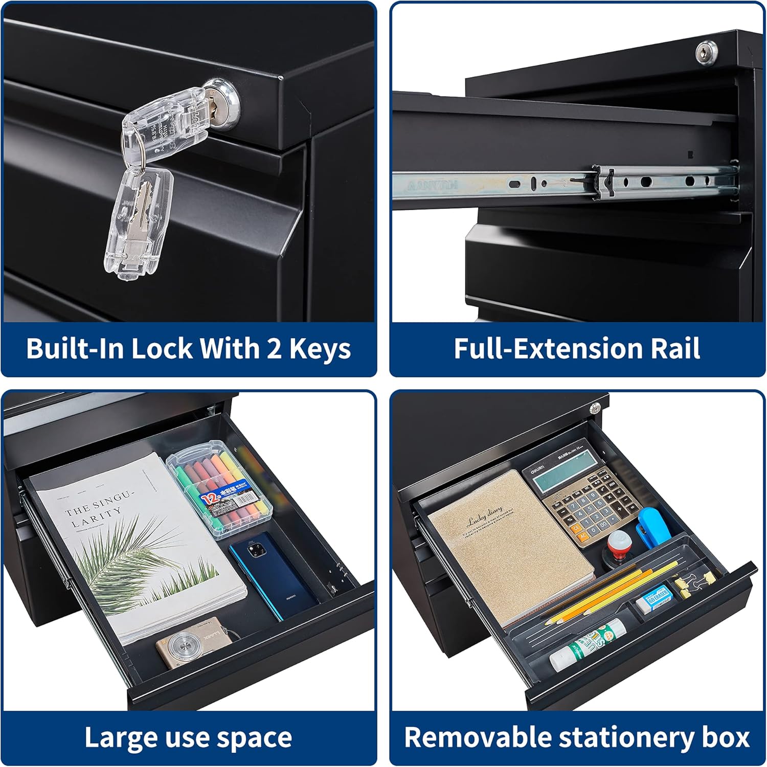 - Optimize your work space: The file cabinet adopts the structure of 3 drawers, 2+1 space combination. Small and large file cabinets can be organized and stored, making your office space more comfortable. Chain mechanism: