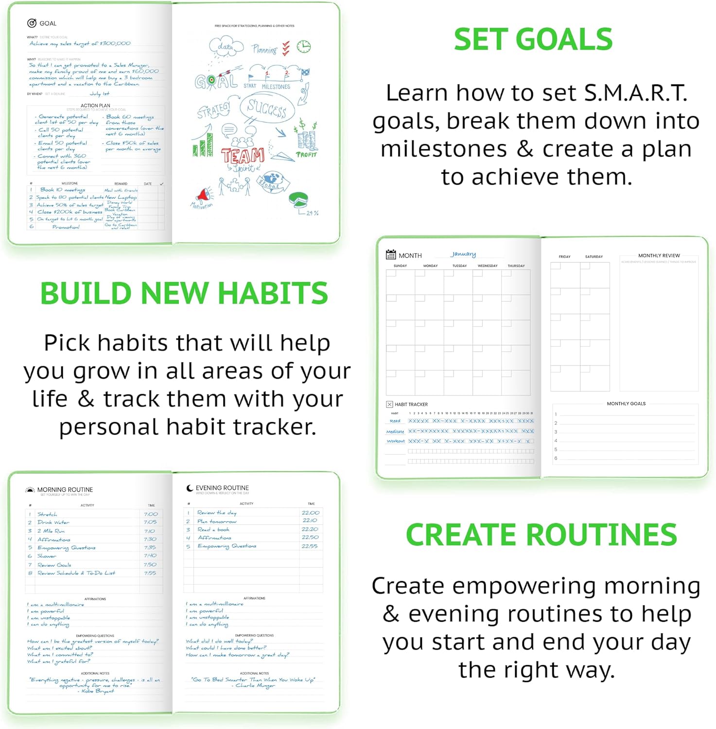 - STAY ALIGNED WITH YOUR GOALS – Use built-in goal-setting tools and review prompts to stay focused on long-term success—whether you’re managing business milestones, career growth, or personal development.