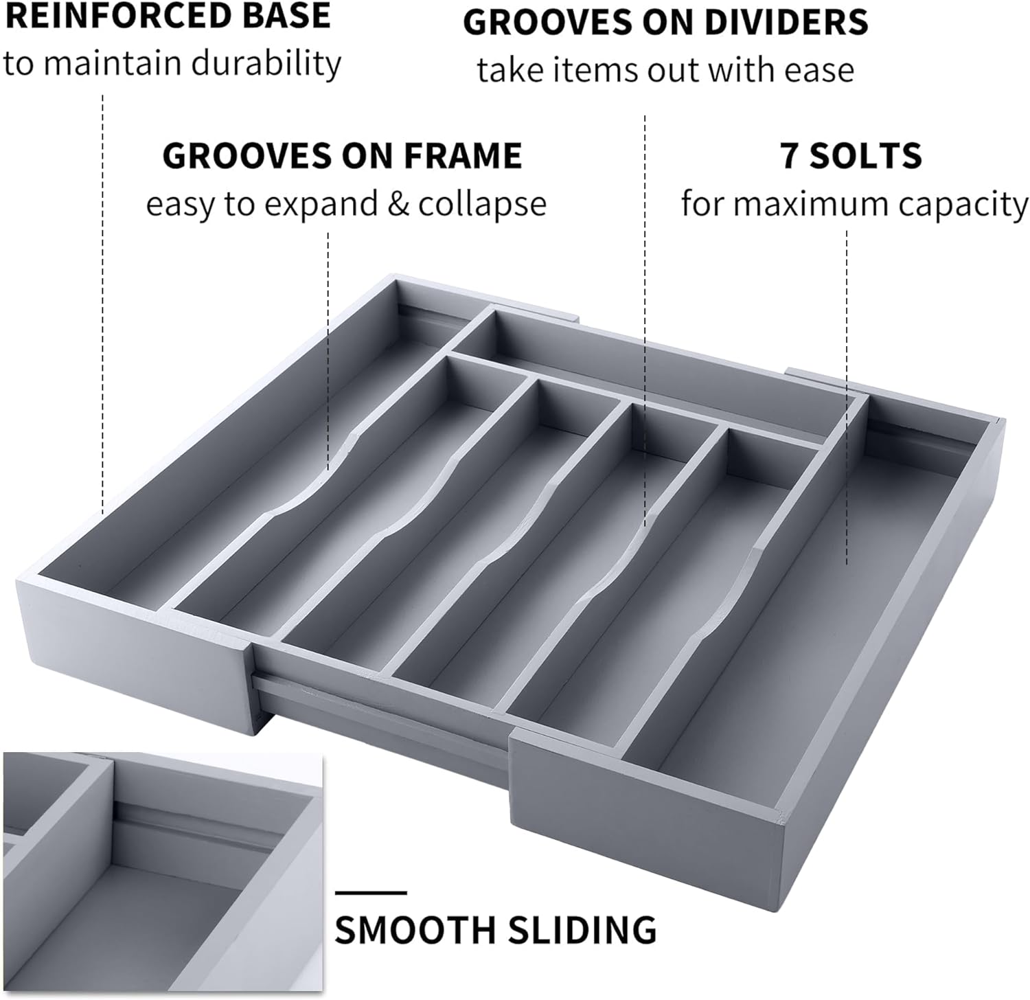 Expandable Bamboo Kitchen Drawer Organizer for Cutlery and Utensils, Adjustable Bamboo Wood Cutlery Tray in Drawer for Flatware and Silverware in Kitchen, (Grey)