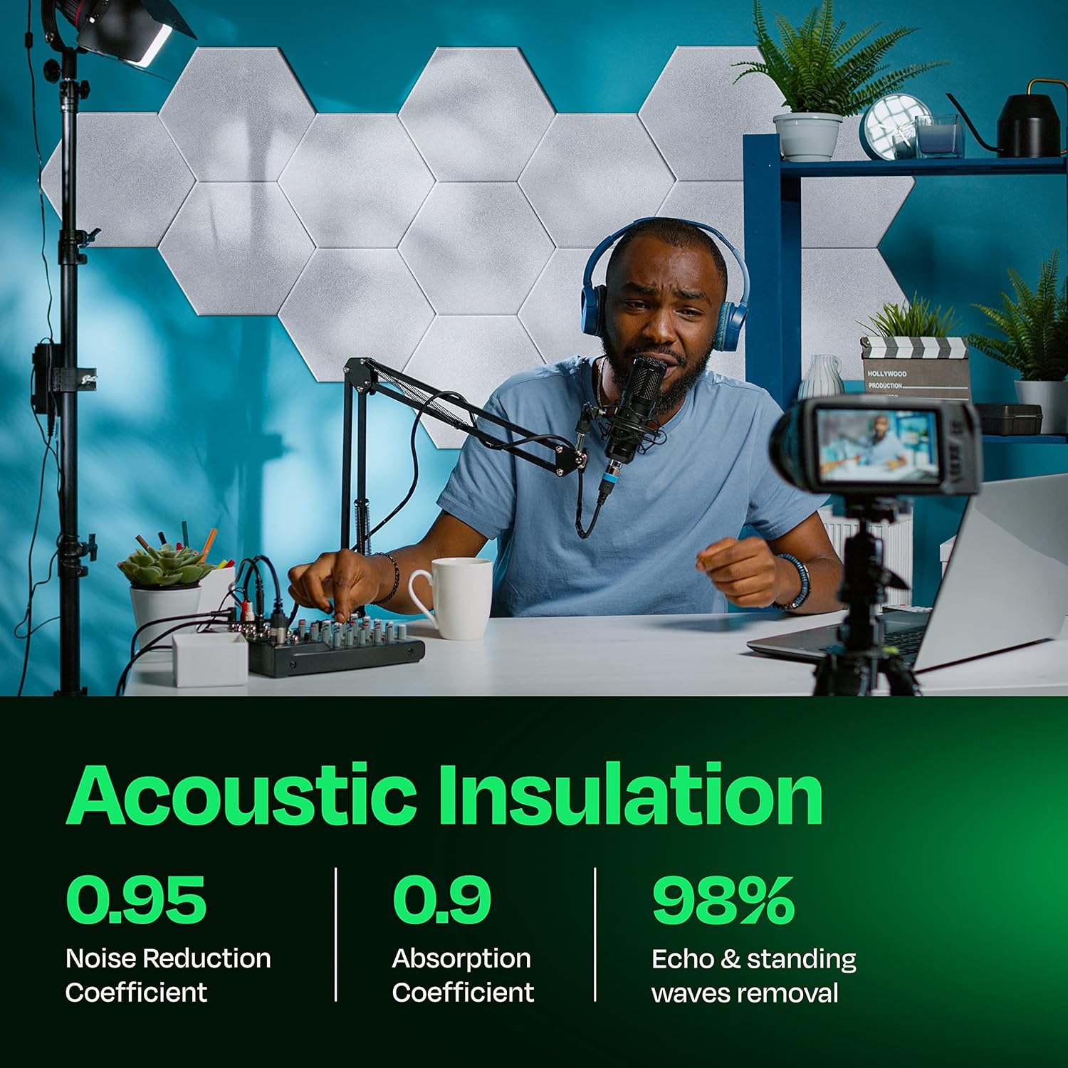 - 【SUPERIOR NOISE REDUCTION PANELS】: Each soundproofing panel is precisely cut of high-density, 5.9oz/ft^2 (1800gr/m^2) poly-fiber panels. Our sound proofing padding for wall reach a NRC rating of up to 0.95, making a big difference to the sounds we hear around us. Pick these hexagon acoustic panels over the old acoustic foam panels and create a beautiful room with superior sound quality.