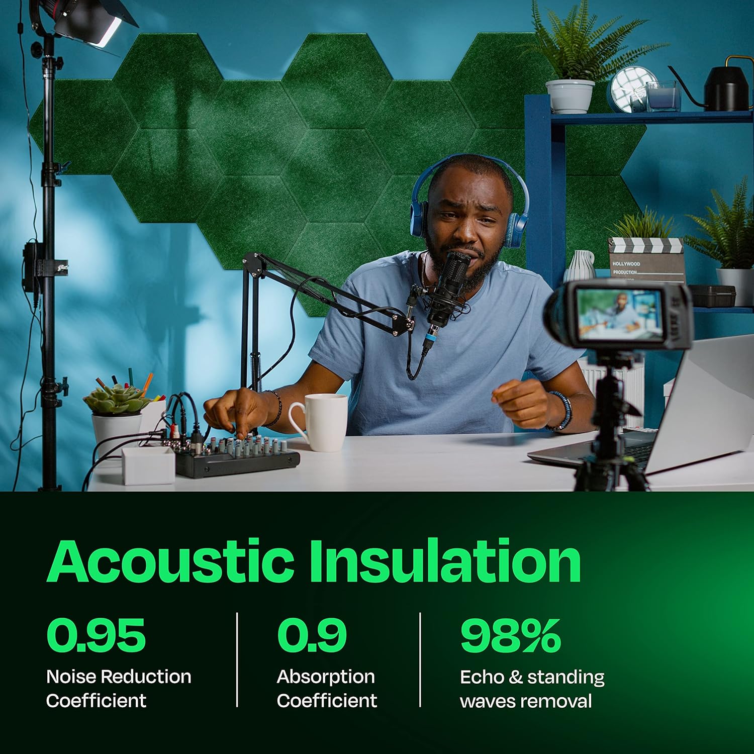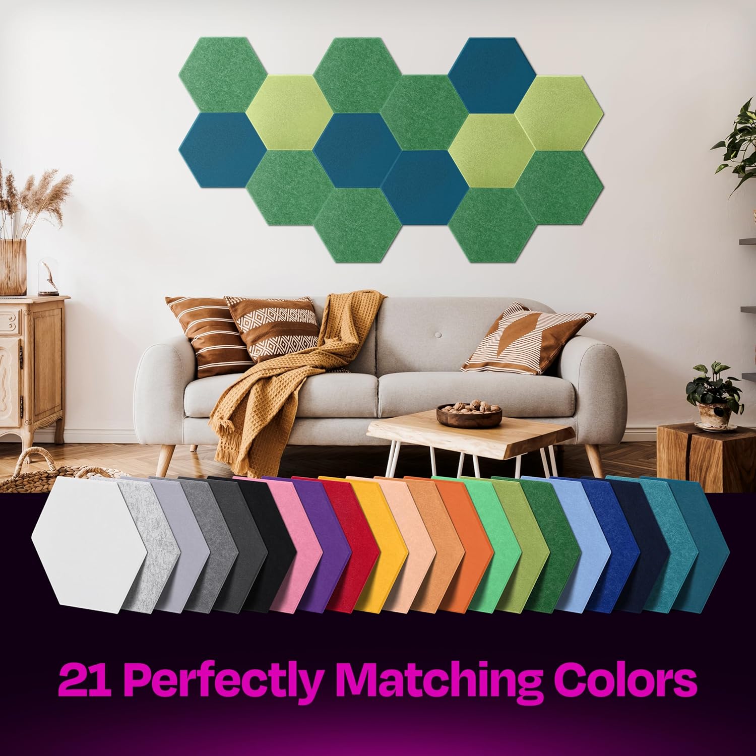 - 【SUPERIOR NOISE REDUCTION PANELS】: Each soundproofing panel is precisely cut of high-density, 5.9oz/ft^2 (1800gr/m^2) poly-fiber panels. Our sound proofing padding for wall reach a NRC rating of up to 0.95, making a big difference to the sounds we hear around us. Pick these hexagon acoustic panels over the old acoustic foam panels and create a beautiful room with superior sound quality.