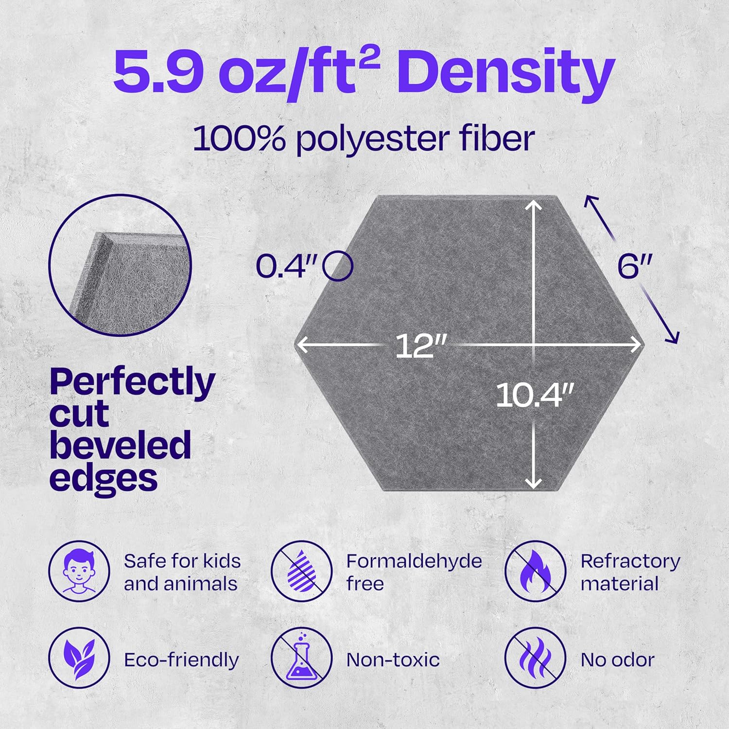 Acoustic Panels 12-Pack - 12"X10.4"X0.4" Sound Panels - High Density Sound Dampening - Pebble Gray Hexagon