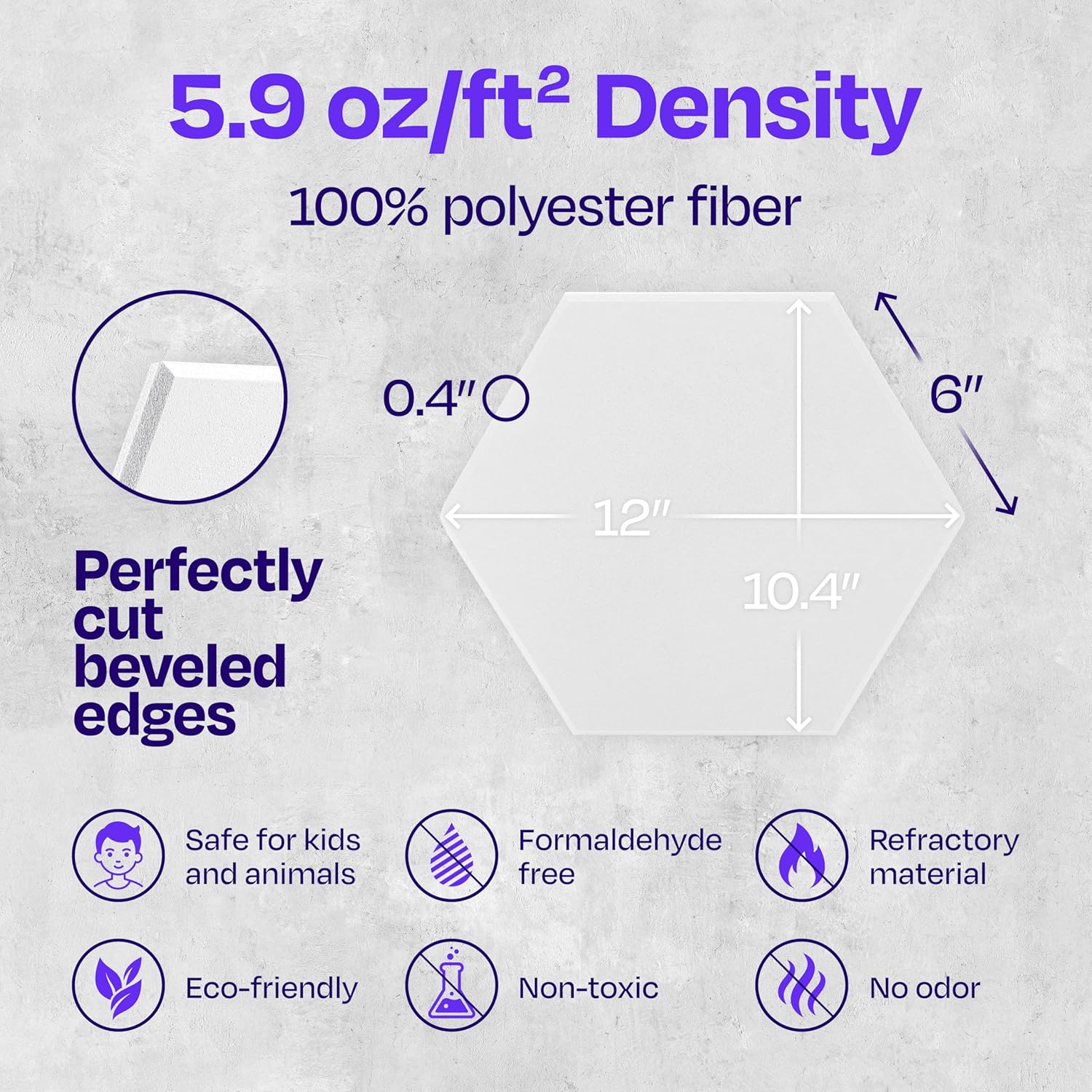- 【SUPERIOR NOISE REDUCTION PANELS】: Each soundproofing panel is precisely cut of high-density, 5.9oz/ft^2 (1800gr/m^2) poly-fiber panels. Our sound proofing padding for wall reach a NRC rating of up to 0.95, making a big difference to the sounds we hear around us. Pick these hexagon acoustic panels over the old acoustic foam panels and create a beautiful room with superior sound quality.
