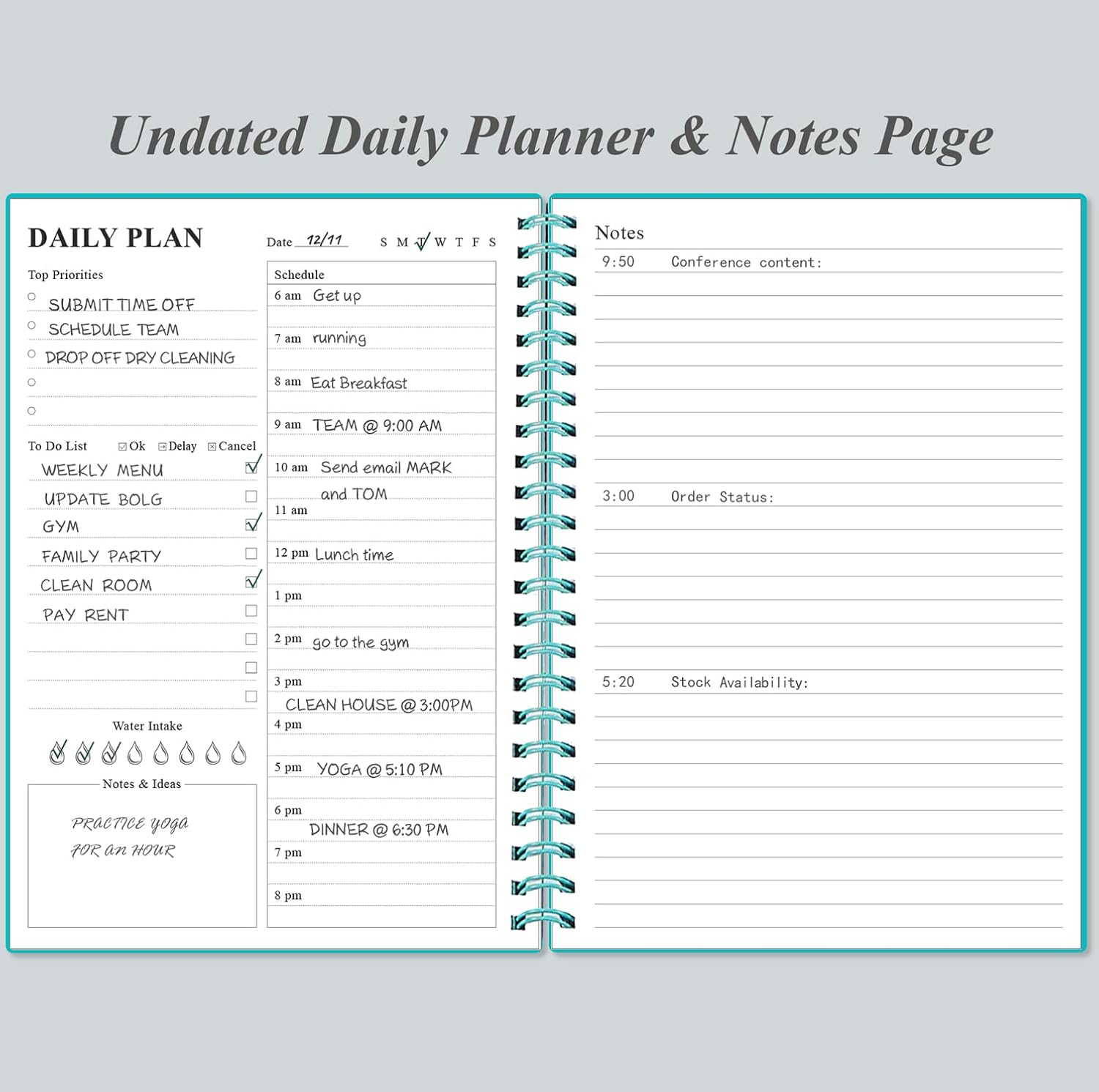 - Work Smarter with Daily Task Management - This daily planner undated each page includes space for 5 top priorities, 9 to do list,daily schedule from 6am-8pm, notes&ideas and water intake.Break your day into hours and help you work effective.