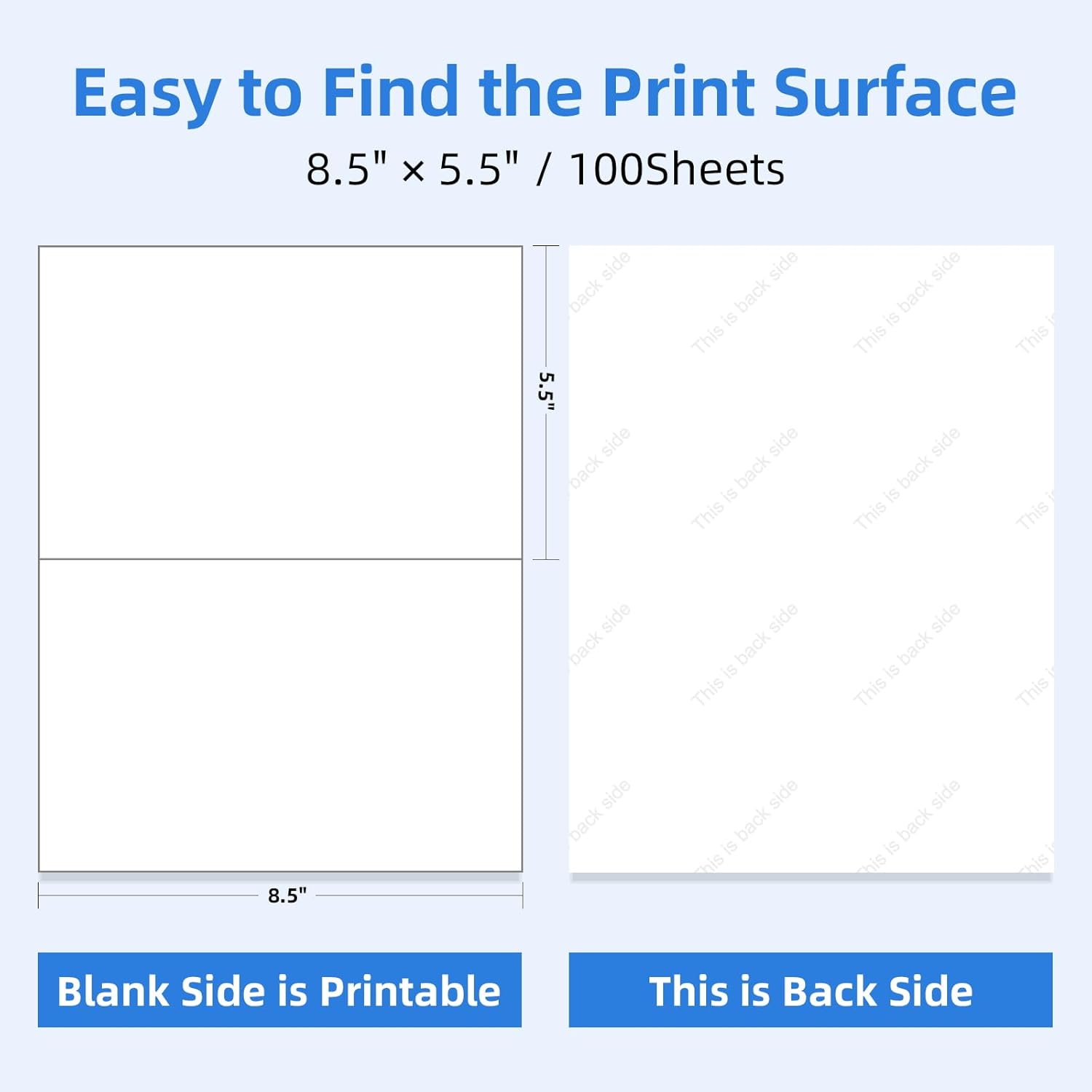 - Labels Size: Sheet Size: 8.5" x 11", Label Size: 8.5" x 5.5". Total 500 Sheets = 1000Labels, Color: matte white.