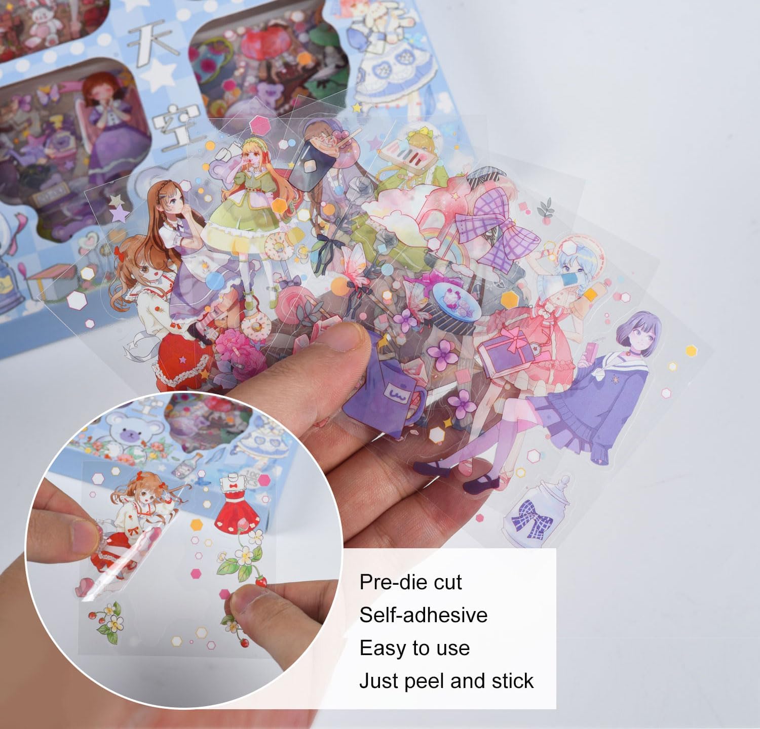- â VALUE SET - Our kawaii cartoon girl stickers are made of high quality PET material. Each set has 100 sheets stickers with different patterns. They consist of a beautiful gift box that measures 180mm*180mm (7.1 inches*7.1 inches). 100 sheets, 4 grids of 25 sheets each. The size of each sheet is 75mm*75mm (3 inches*3 inches).