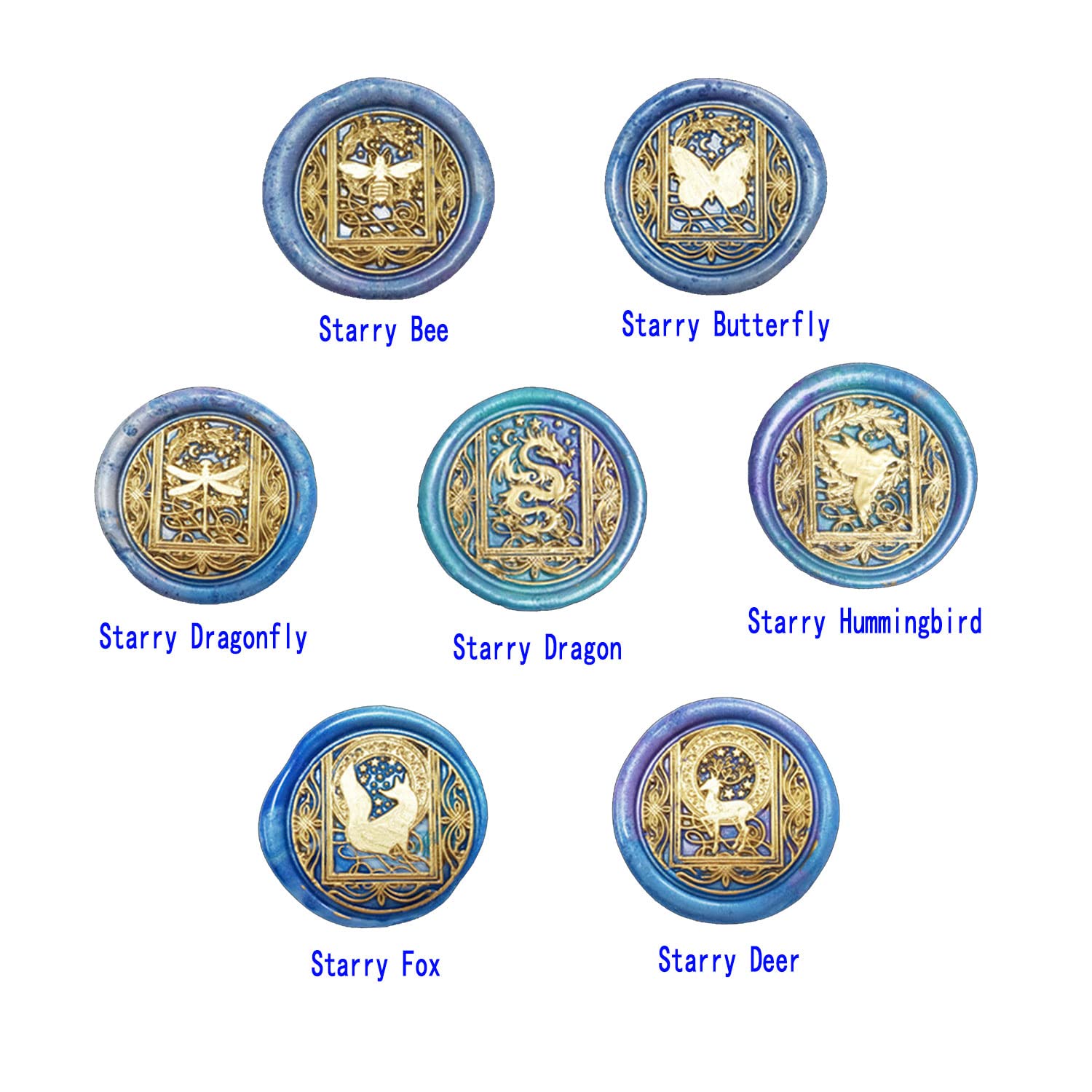 - [Package Includes] ANBOSE wax seal stamp kit includes 1 PCS Wooden handle,1 PCS Starry Butterfly wax seal stamp, 1 PCS Starry Dragonfly wax seal stamp, 1 PCS Starry Bee wax seal stamp, 1 PCS Starry Dragon wax seal stamp,1 PCS Starry Hummingbird wax seal stamp, 1 PCS Starry Fox, 1 PCS Starry Deer and 1 Gift box.