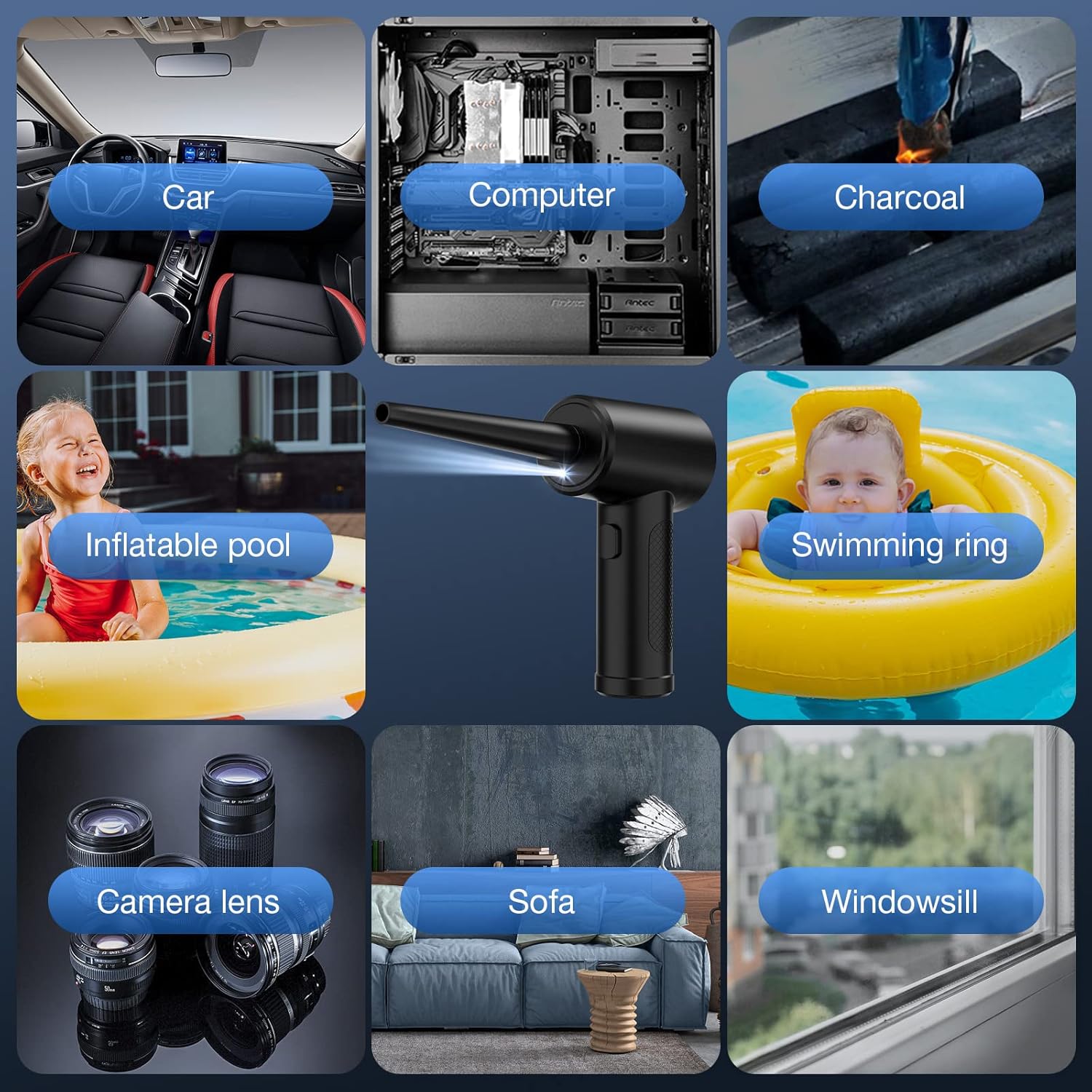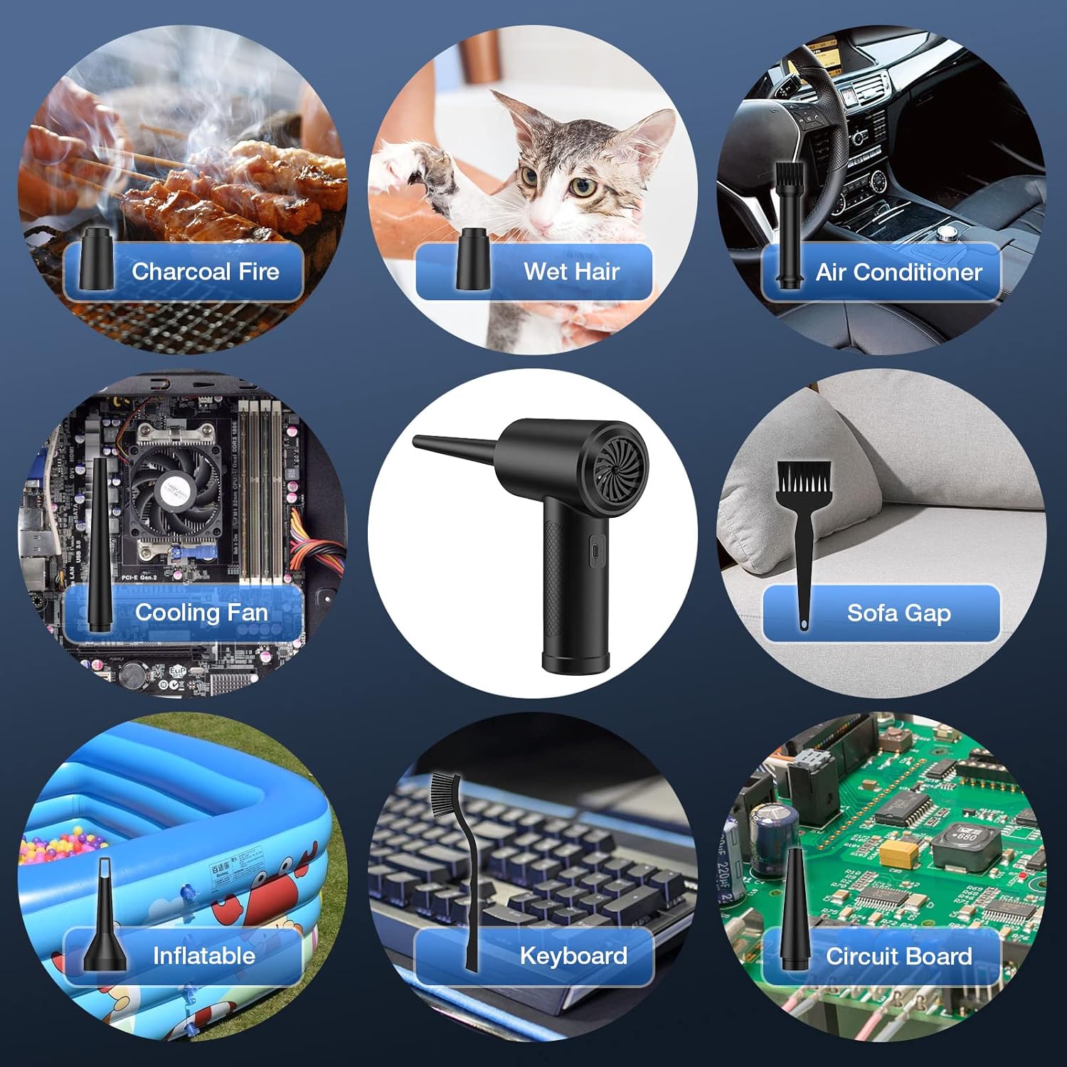 - Multiple Usage Scenarios: Our PC Cleaning kit is equipped with 5 nozzles and 2 brushes, great suitable for many scens, such as keyboard cleaning kit, electric leaf blower, car detailing supplies, pc duster, snow blower, turbo fan, car dryer, air broom, camera cleaner and so on. The diversification nozzles allow you to use for outdoor picnics to blow fires, clean pet hair, inflate swimming rings, yoga balls, air mattresses, etc.