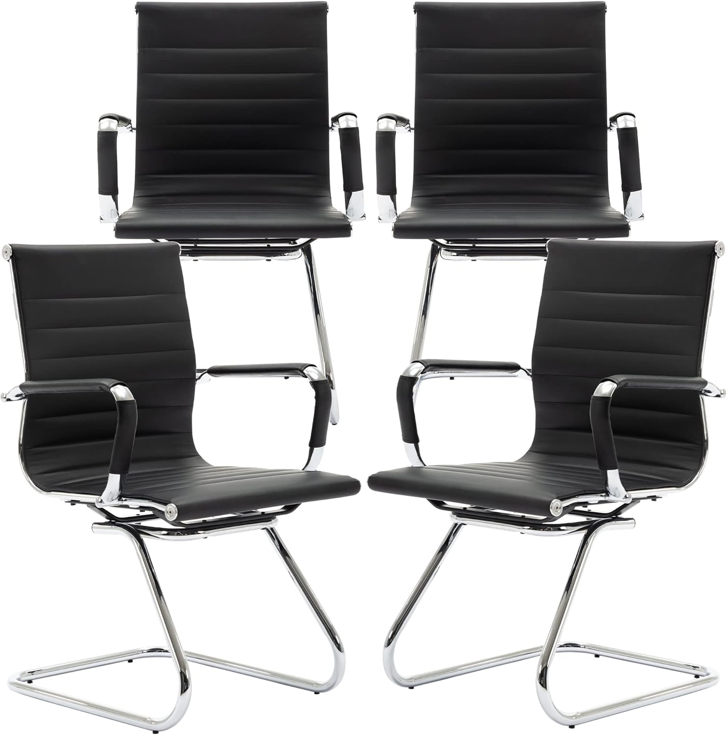 Black Office Desk Chair No Wheels Set of 4 PU Leather Computer Chairs Mid Back Guest Chairs for School Reception Conference Waiting Room, Black