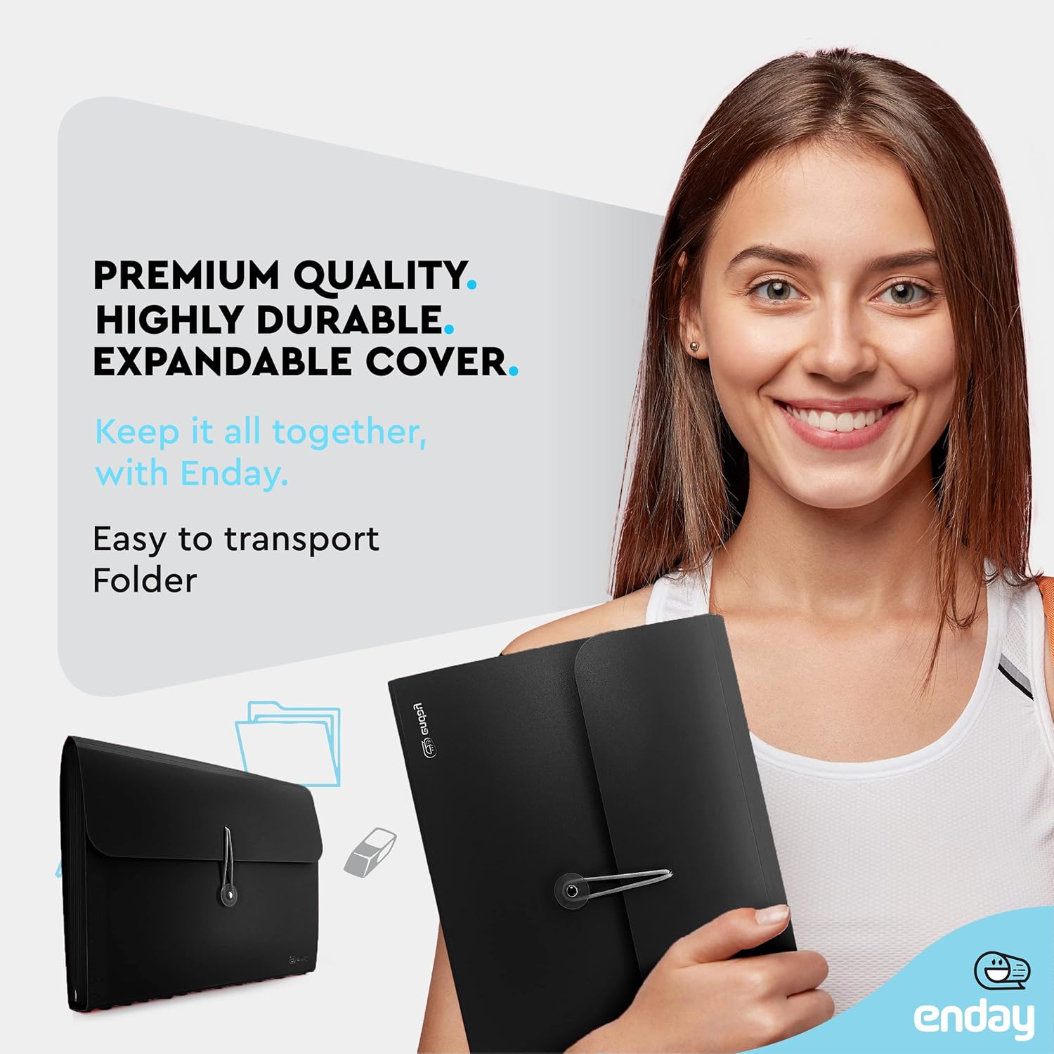 Accordion File Organizer Black, 13 Pocket Expanding File and Cover Folder with Labels, Plastic Portable Desktop Letter A4 Paper – by Enday