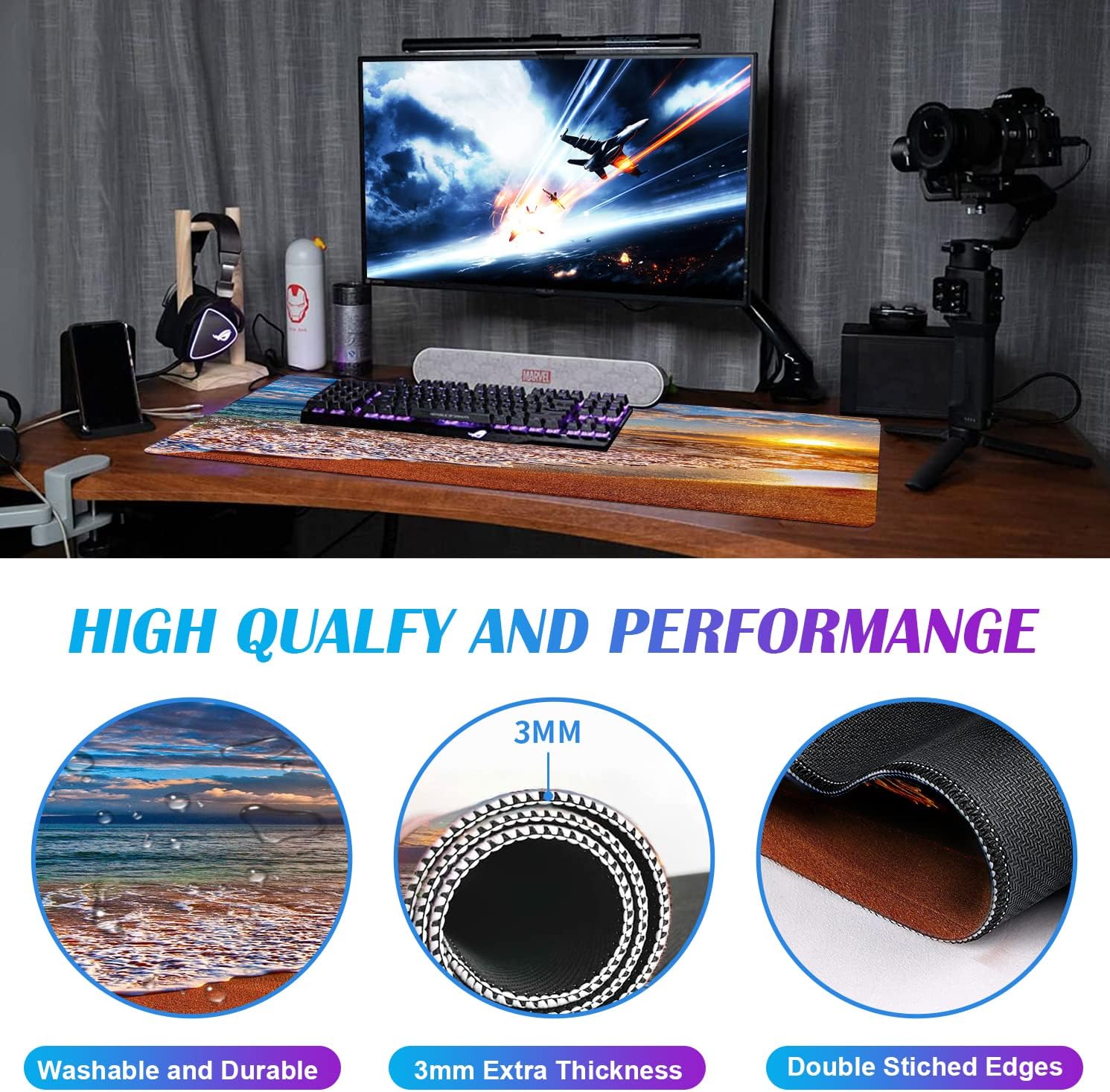 - Large and Extended Dimensions: 35.4" x 15.7" x 0.12" (900 mm X 400 mm), 3 mm thick. It will fit your desktop perfectly and provide the perfect space to move around, you can also use this extended mouse pad as office, gaming, keyboard pad, platform protector or desk pad, and for all types of mice and more.