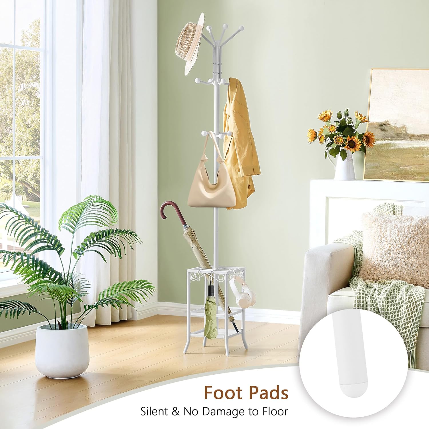 - Functional Umbrella Holder: Featuring an umbrella stand, this coat tree can hold both long-handle and folding umbrellas. The bottom tray is designed to protect your floors from rain water damage, providing a reliable storage solution for wet umbrellas