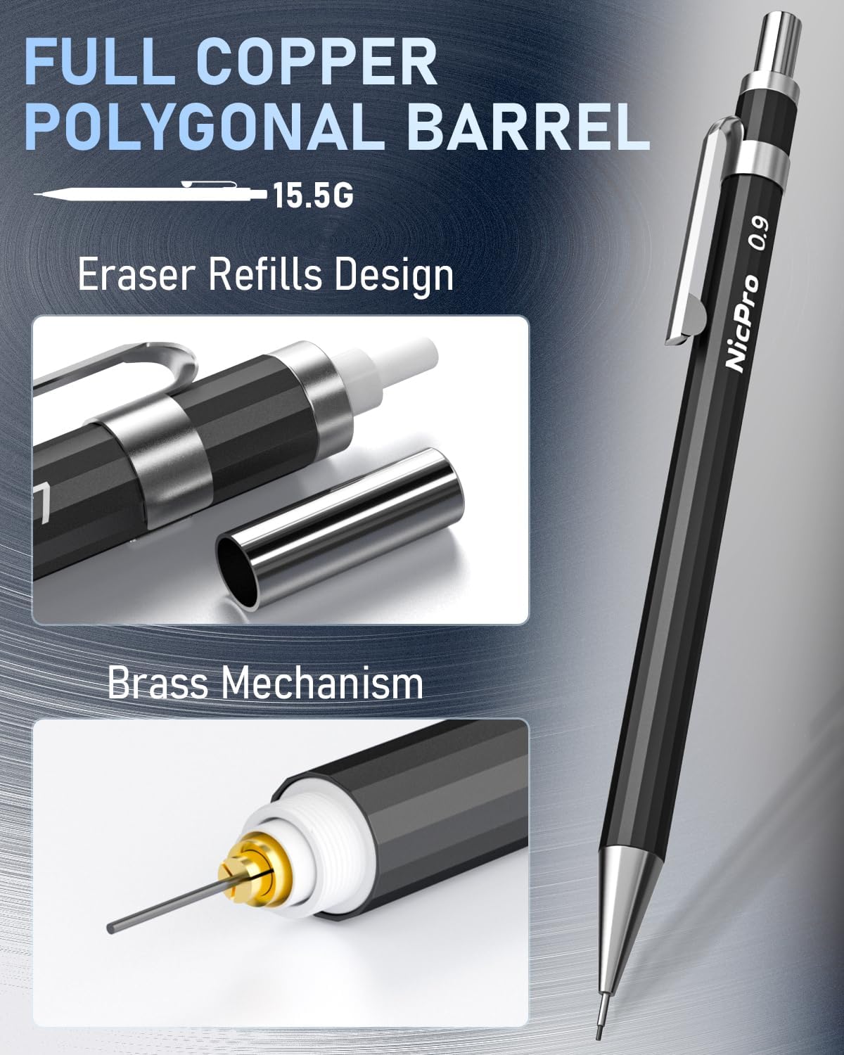 Nicpro 6 PCS Art Mechanical Pencil Set, Black Metal Drafting Pencil 0.3, 0.5, 0.7, 0.9 mm & 2PCS 2mm Graphite Lead Holder(4B 2B HB 2H) For Writing Sketching Drawing With 8 Lead Refills Eraser Case