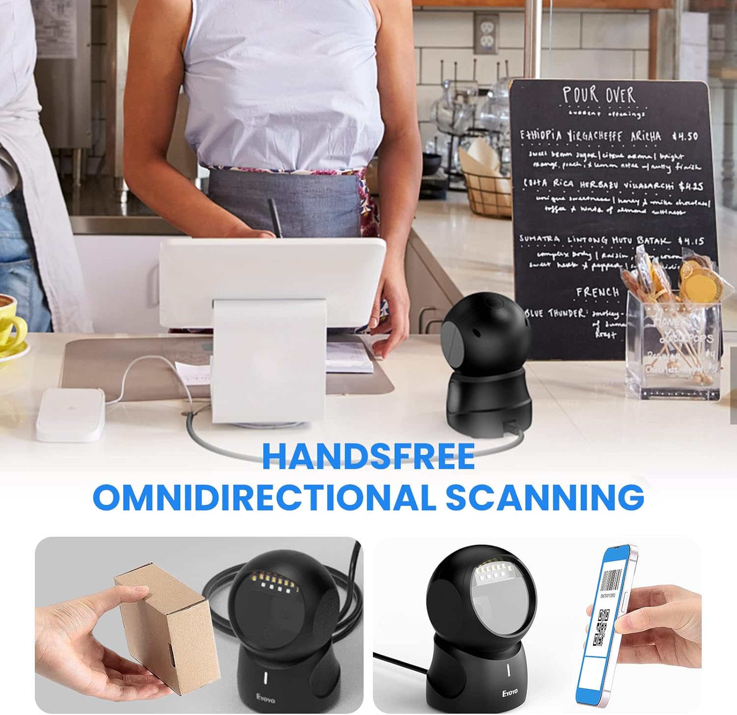 - Hands-free Design, Improve Efficiency: You don't need to hold the barcode scanner or press any buttons, just place the USB scanner on the desktop to automatically scan the code. You're able to freely use both hands and work efficiently, saving more time over time