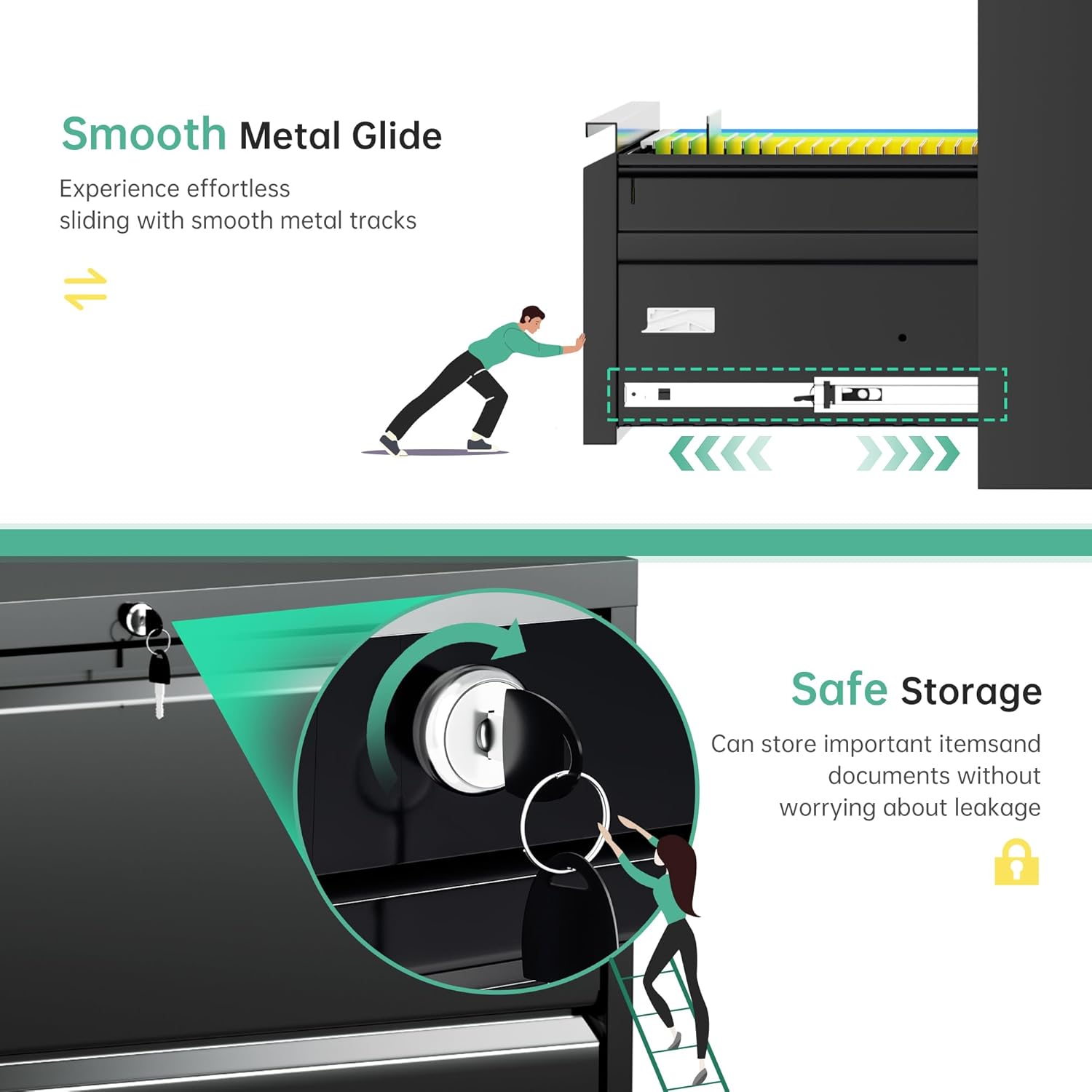 Superday Black Filing Cabinet 3 Drawer File Cabinet 20" Deep, Locking Metal File Drawer Cabinets, Rolling Filing Cabinets with Lock for Office Letter/A4/Legal (Black)