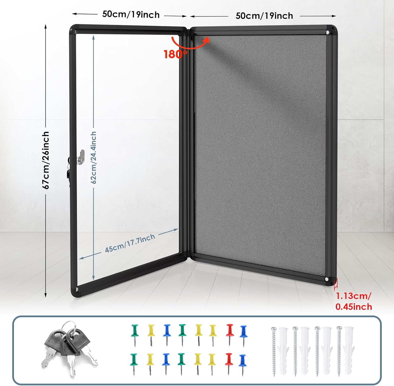 - HIGH-QUALITY MATERIAL:It is made of grey felt pin board, durable aluminum construction, shatter-resistant acrylic door and ABS rounded corners