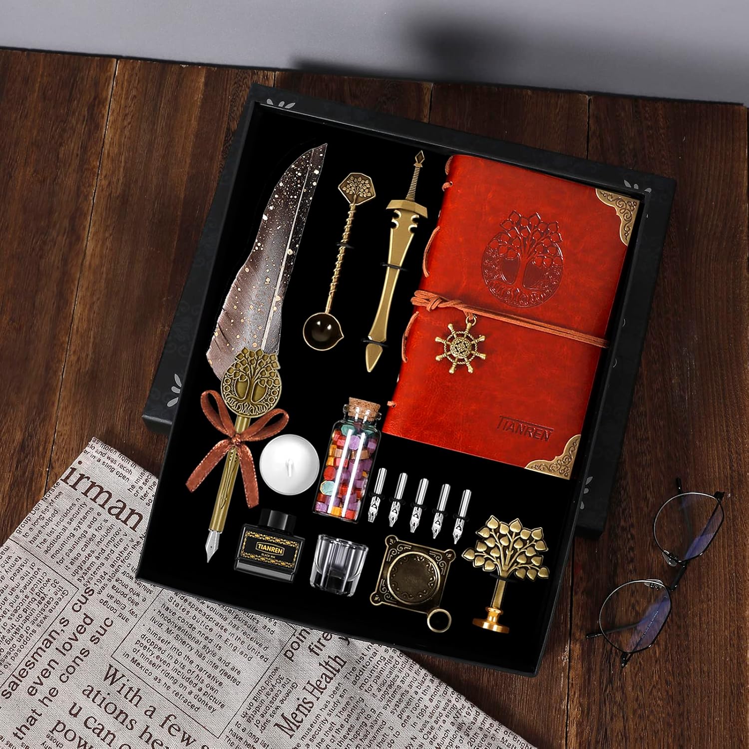- 【Calligraphy Pen Set Included】-1 x feather dip Pen, 1 x bottle of black Ink,1 x bronze pen holder,1 x metal wax seal stamp,1 x bottle of wax sealing beads,1 x glass cup,1 x bronze wax melting spoon,1 x bronze letter opener,5 x different sizes stainless steel replaceable nibs,1 x round white wax,1 x refillable pu leather notebook,1 x vintage envelope,1 x vintage writing paper,1 x unique gift box,the TIANREN antique quill pen ink set meets everything you need it.