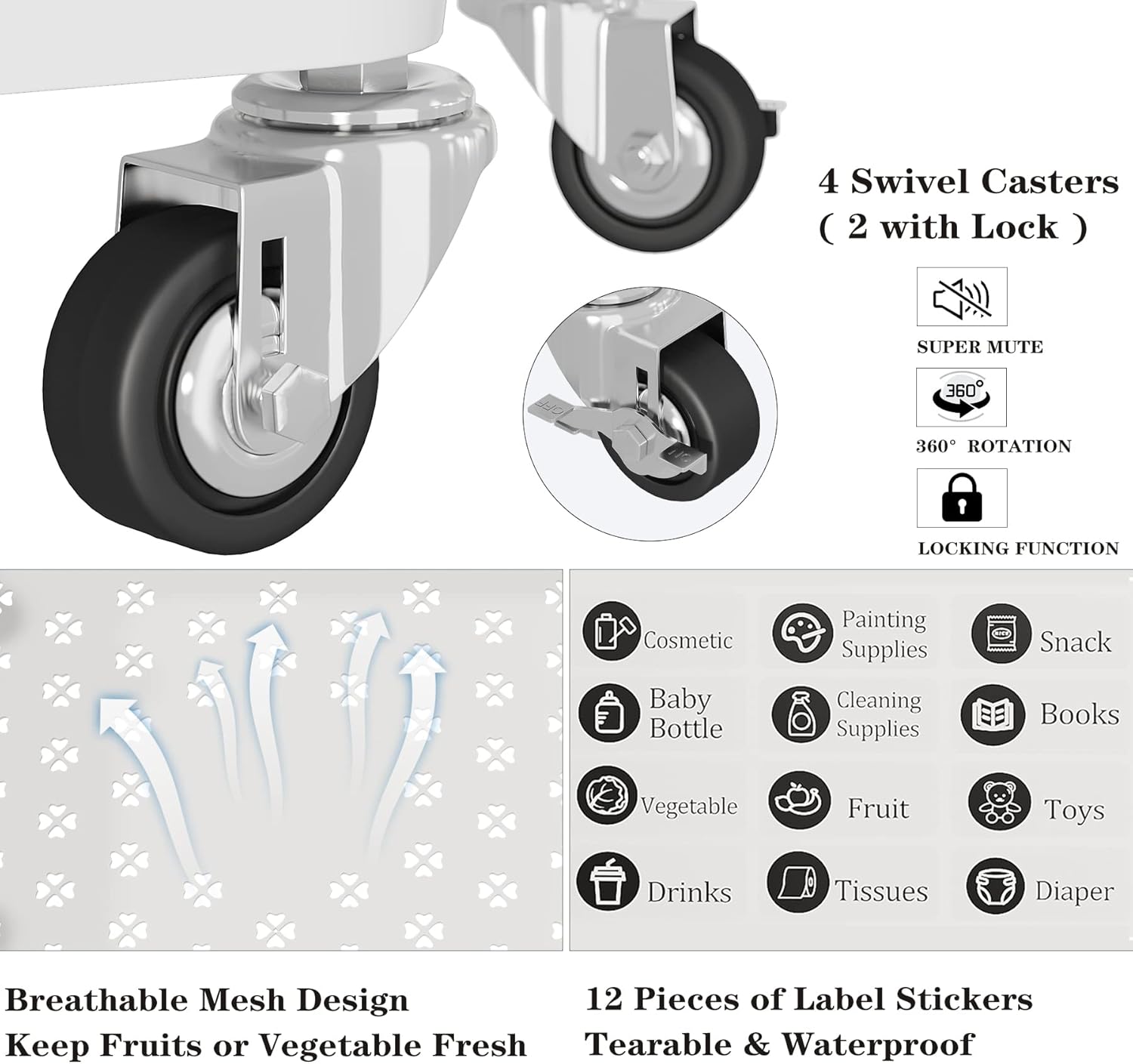 UDEAR 4-Tier Rolling Utility Cart with 12 Category Labels,Multifunctional Storage Shelves with Handle and Lockable Wheels for Room,Office,Kitchen,Bathroom,White