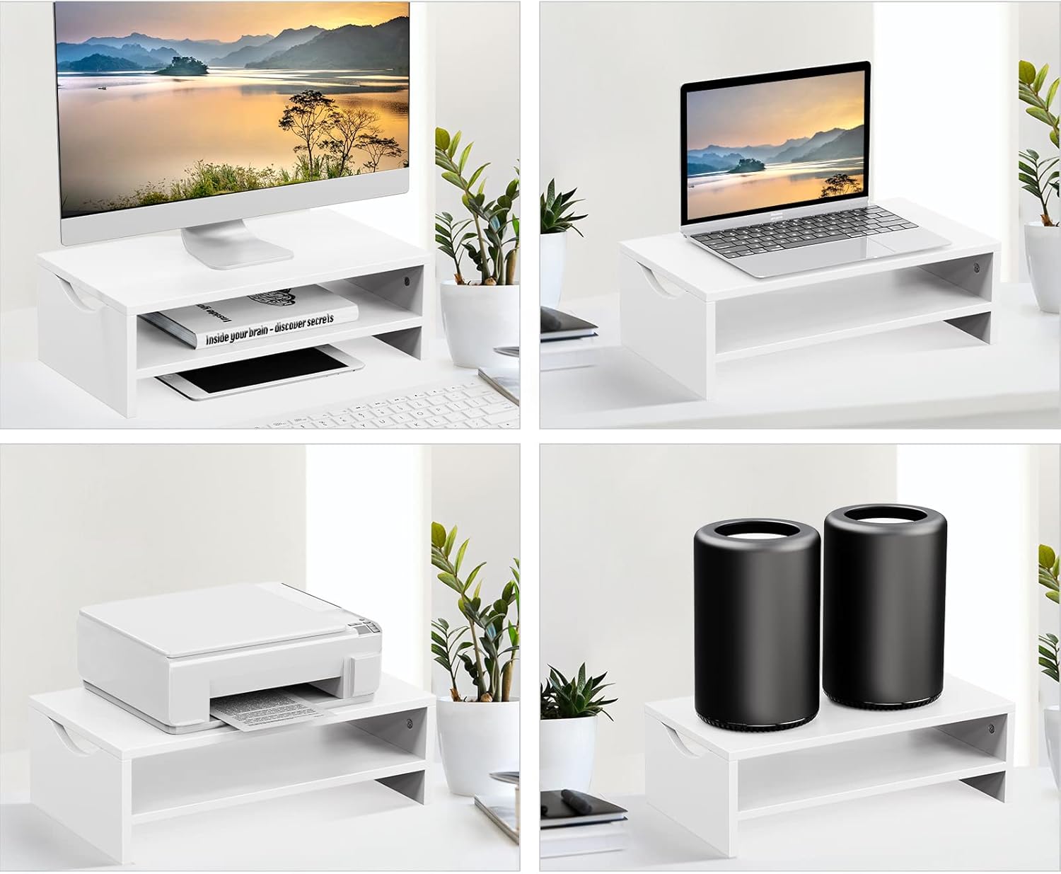 - Save Your Space: Get rid of the messy desks! 2-Tier monitor risers provide more storage space to keep your workstation organized and tidy. It can store many office supplies such as books, notebooks, earphones, power banks, paper, etc.