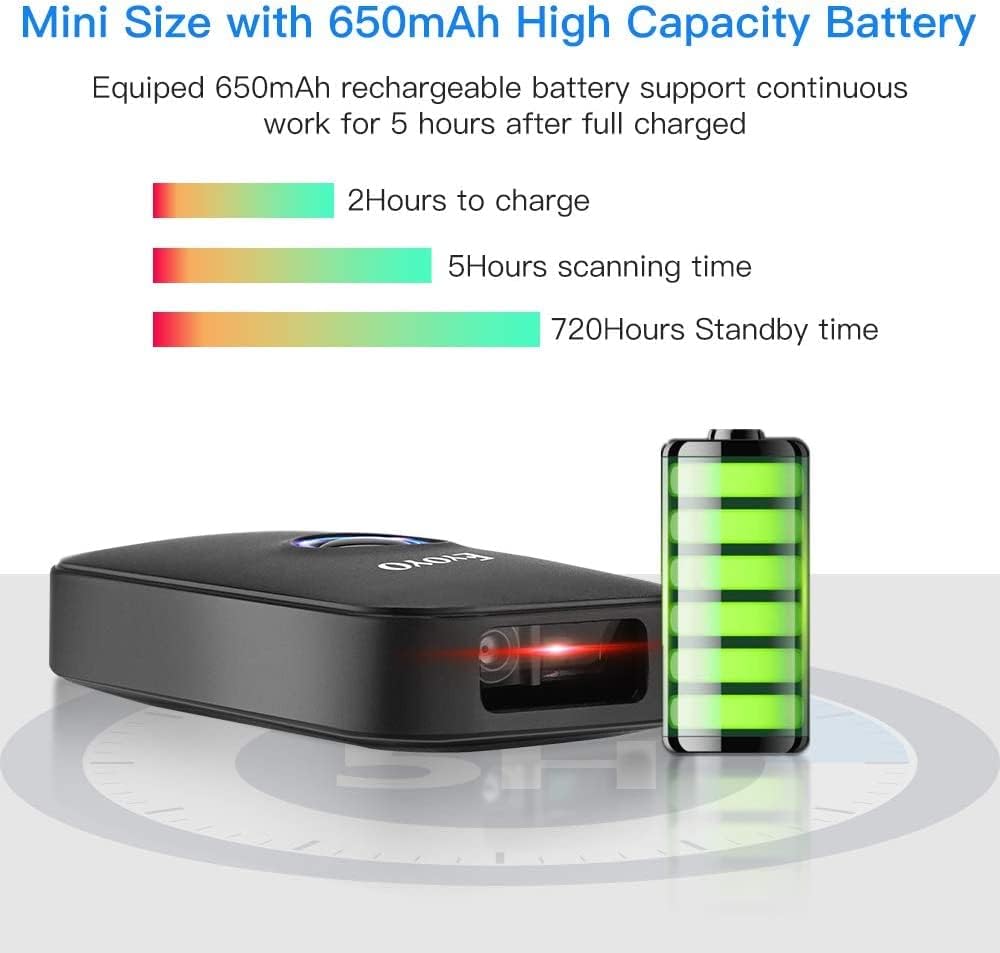 - 【High Compatibility & 650mAh High Capacity Battery】: Eyoyo scanner can connect with laptop, PC, POS, smartphone, tablet, iPhone, iPad and computers to perfectly work with common operating systems such as windows xp/7/8/10, Mac OS, Linux, Windows Mobile. Also with 650mAh rechargeable battery can continuously work for 5 hours after 2 hours fully charged.