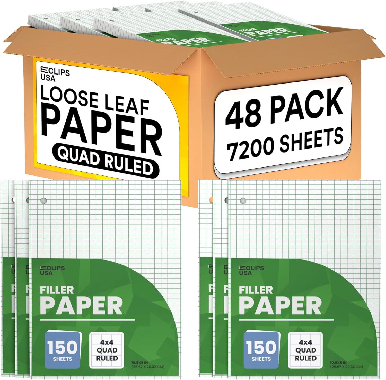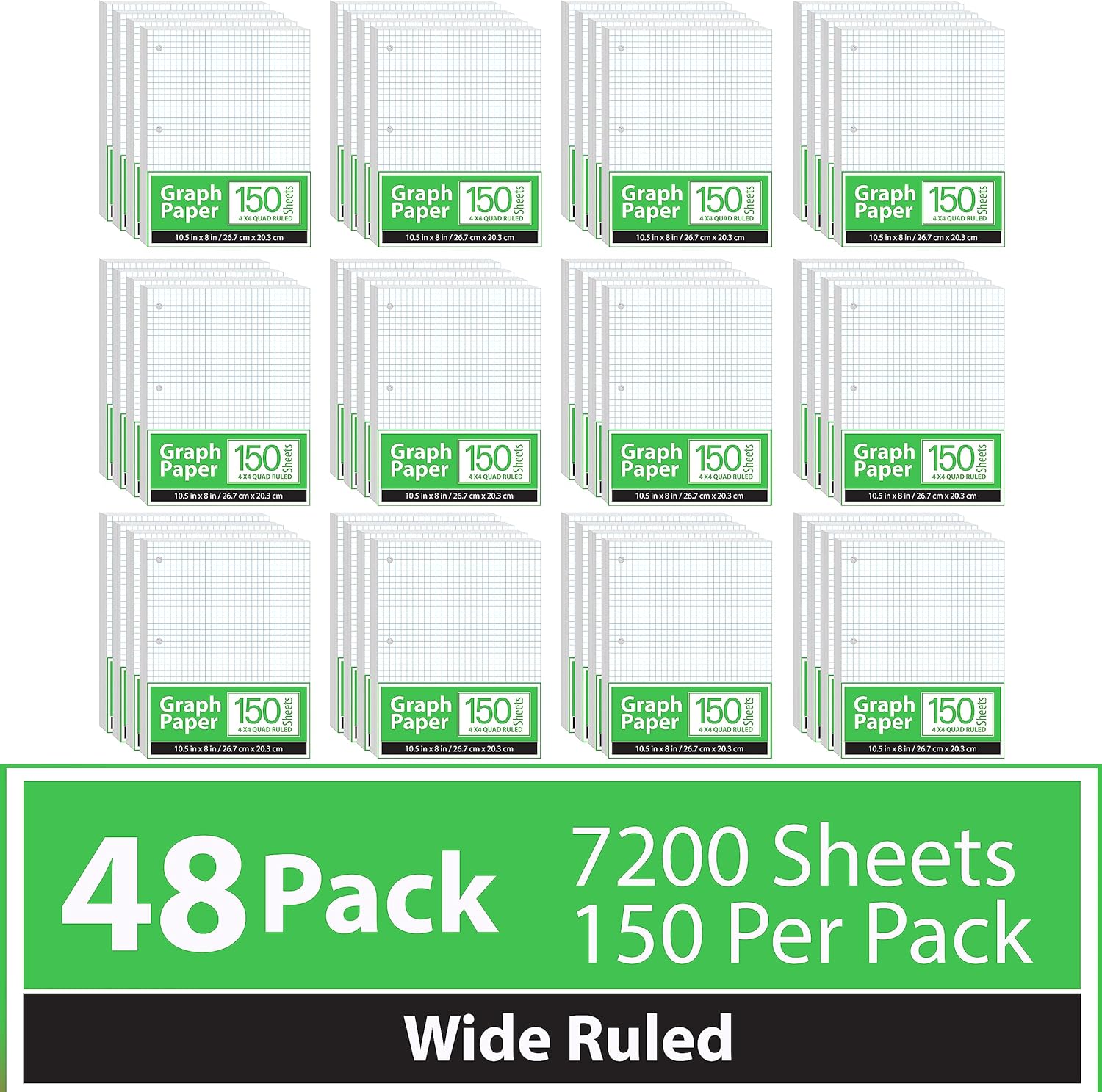 Graph Paper, Loose Leaf Graph Paper, 4 x 4 Squares Per Inch Quad Ruled Graph Paper, 10.5” x 8” Graphing Paper, 56 gsm, 150 Per Pack, 7200 Sheets (48 Pack)