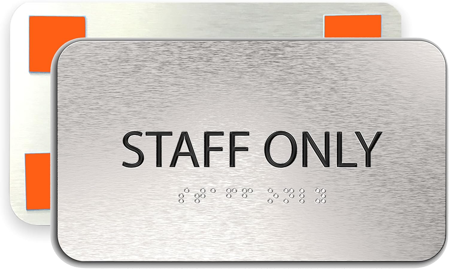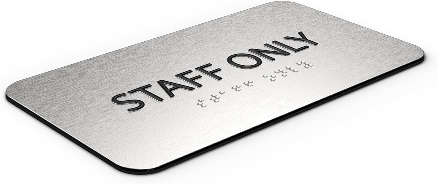 - šš„ššš¤ šš§š šš«šØššš¬š¬š¢šØš§šš„ ššš¬š¢š š§: Crafted with a brushed aluminum finish, the staff only signs for doors with braille features bold black text for high visibility while maintaining a modern and polished aesthetic. Its understated design blends seamlessly into any interior or exterior setting, making it an elegant addition.