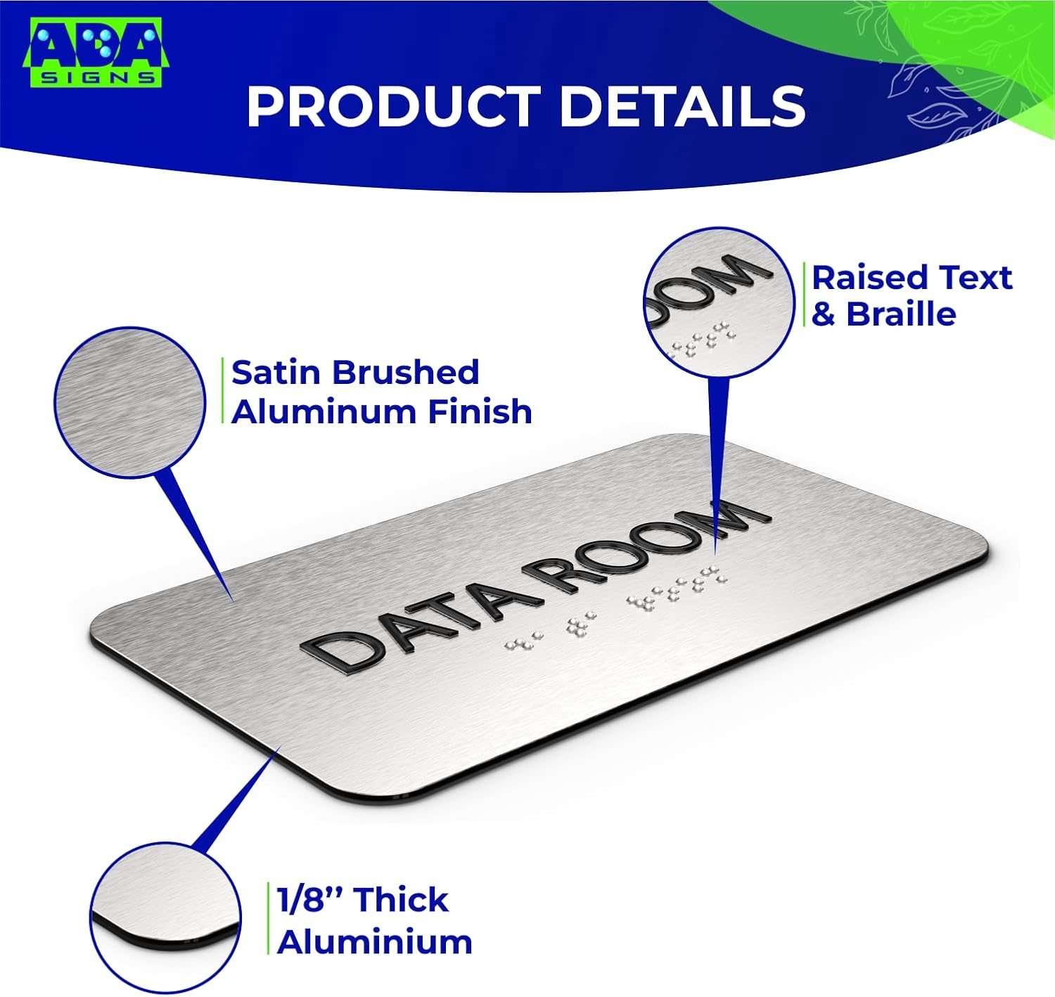 ADASigns Data Room Sign 7" W x 4" H - Durable Brushed Aluminum with Grade 2 Braille - Easy Installation with Strong Double Sided Tape - ADA Compliant Office & Businesses Signs for Wall