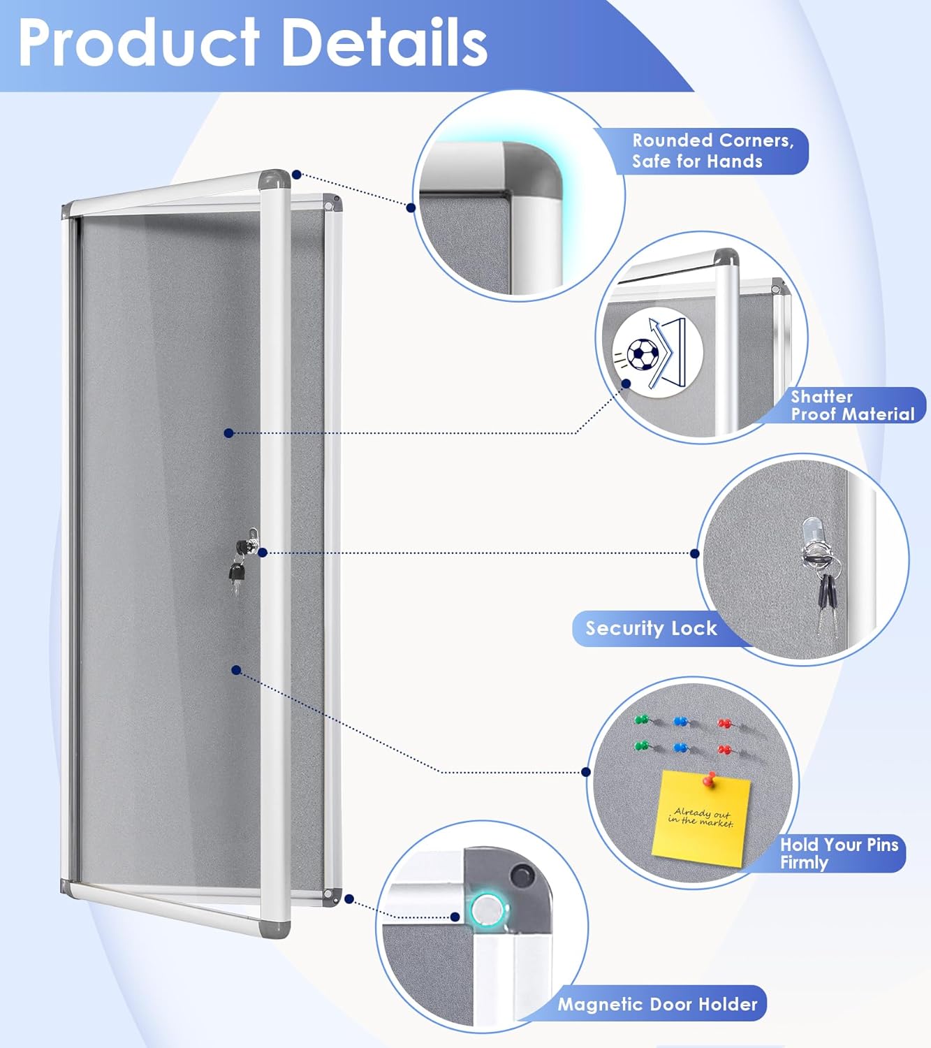 SWANCROWN Enclosed Noticeboard Grey Frabric Bulletin Boards Lockable Display Case Tamperproof with Keys Pins,38x14inch