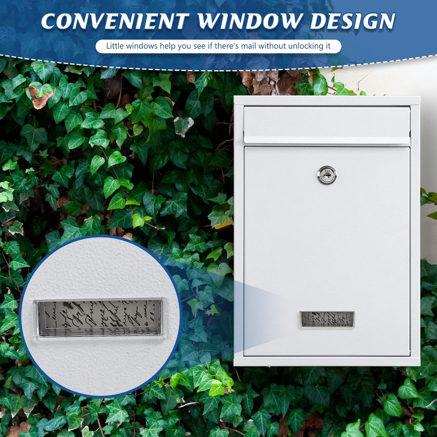 - MODERN & STYLISH LOOK: Mail box with elegant and modern design , which is prefect to decorate the exterior of the house.Metal Wall-mounted Mail box with transparent cover,You don't have to open mailbox to see if there's a letter inside.Also, it is environmentally friendly paint, so it isn't harmful to the body.