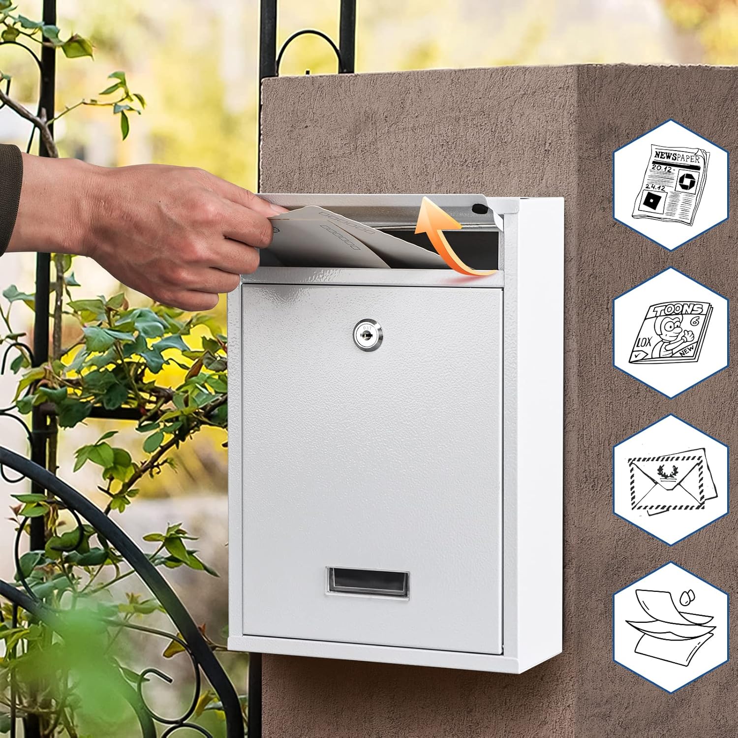 KYODOLED Key Lock MailBoxes for Outside, Locking Wall Mount Mailbox, Security Key Drop Box for Letters Newspapers, Cards, 12.4H x 8.54L x 3.35W Inches, White